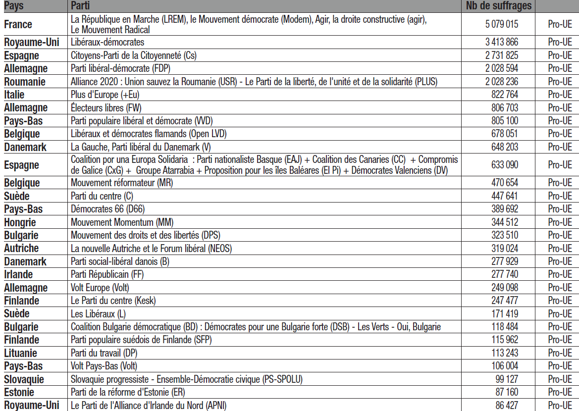 Cet électorat est constitué des votes favorables à des listes défendant l’économie sociale de marché, des valeurs axées sur les libertés individuelles et une vision de l’Europe d’inspiration fédéraliste. Les électeurs de La République en Marche en France et de Ciudadanos en Espagne représentent à eux seuls presque un tiers de cet électorat.