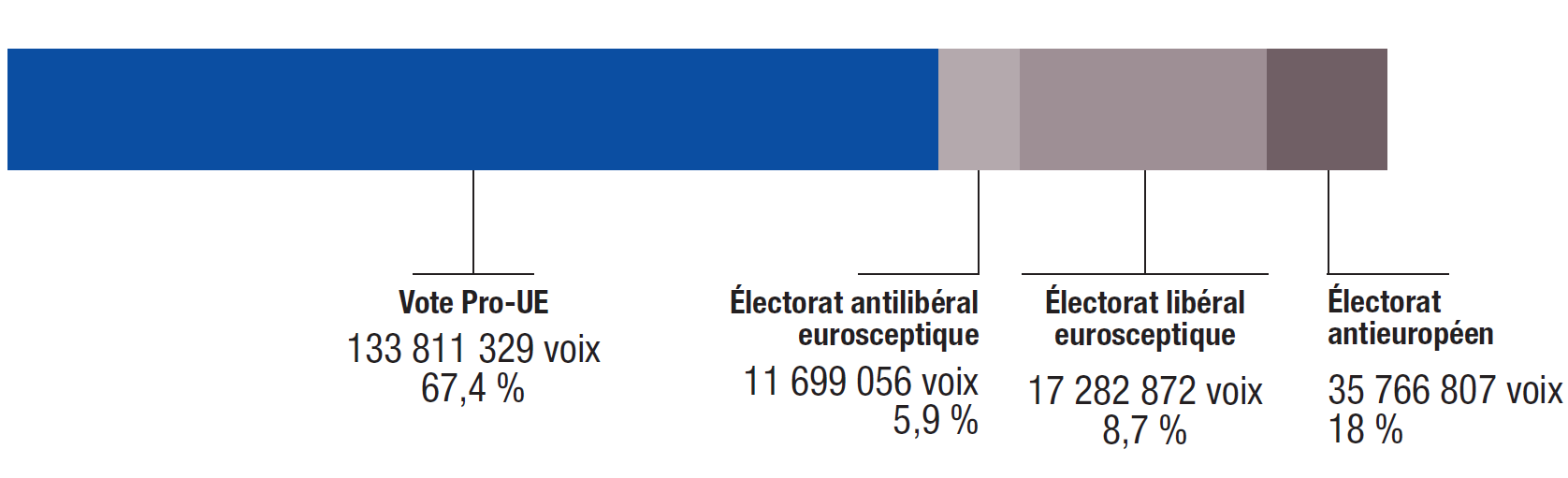 Le vote proeuropéen, de droite, de gauche, écologiste et autre, a réuni 133.811.329 électeurs, soit 67,4% des suffrages exprimés et 33,6% des électeurs inscrits.