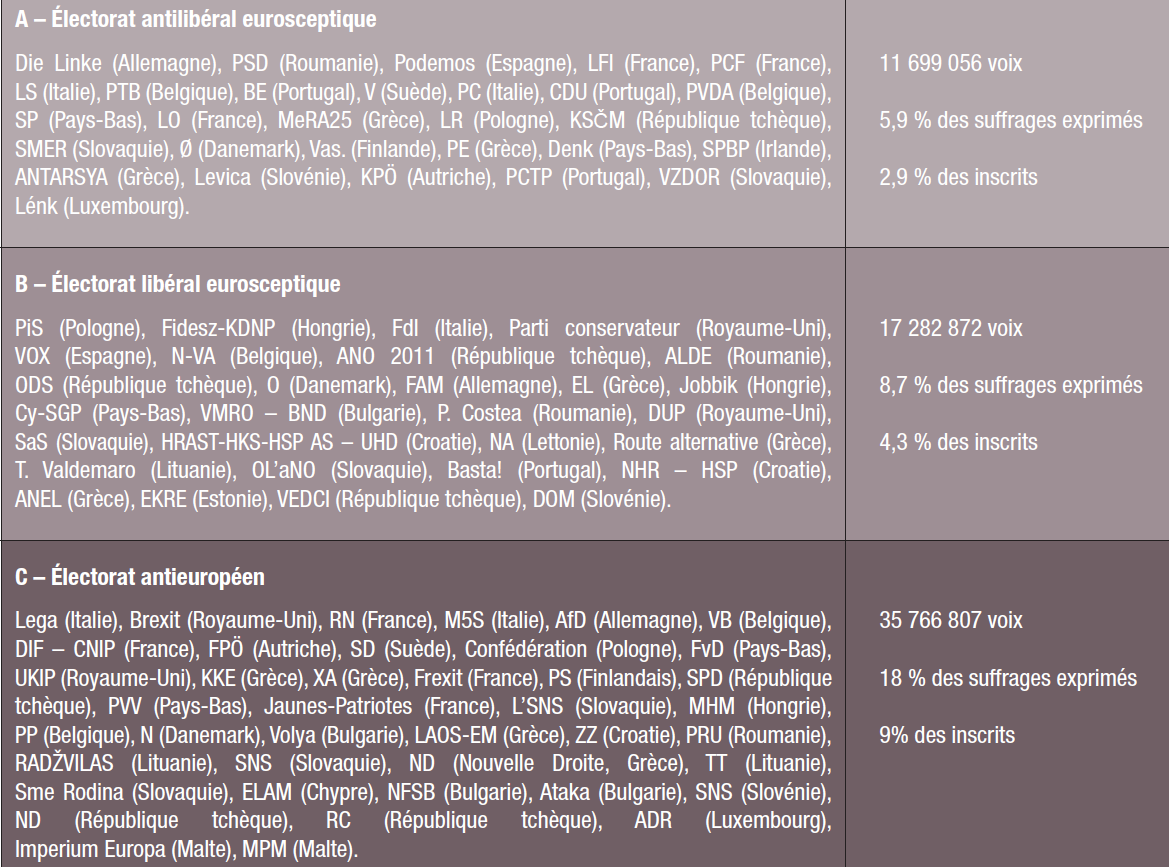 - L’électorat antieuropéen (C) regroupe les électeurs ayant voté en faveur de listes portant à la fois les thèmes du vote antilibéral eurosceptique et ceux du vote libéral eurosceptique : affirmation de la souveraineté étatique, de l’identité nationale, chauvinisme social. L’électorat antieuropéen correspond à des partis qui souhaitent ou qui ont déjà envisagé une sortie de leur pays de l’Union européenne, ou de certaines de ses politiques, par exemple l’euro.