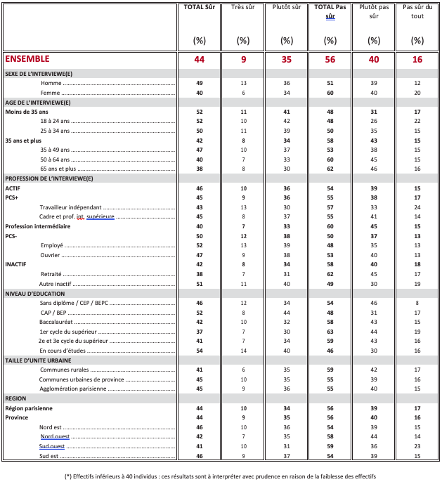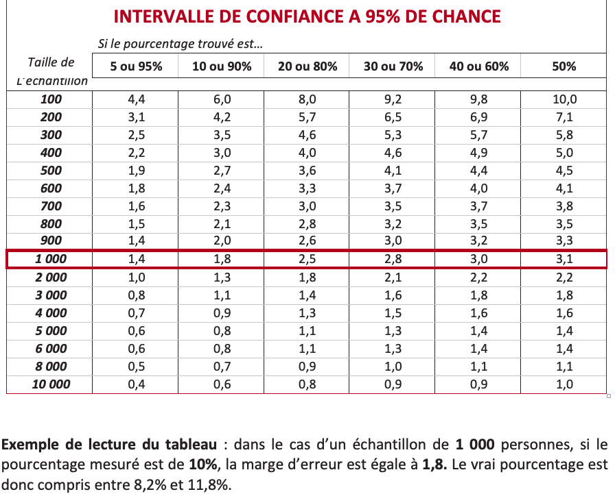 La théorie statistique permet de mesurer l’incertitude à attacher à chaque résultat d’une enquête. Cette incertitude s’exprime par un intervalle de confiance situé de part et d’autre de la valeur observée et dans lequel la vraie valeur a une probabilité déterminée de se trouver. Cette incertitude, communément appelée « marge d’erreur », varie en fonction de la taille de l’échantillon et du pourcentage observé comme le montre le tableau ci-dessous :