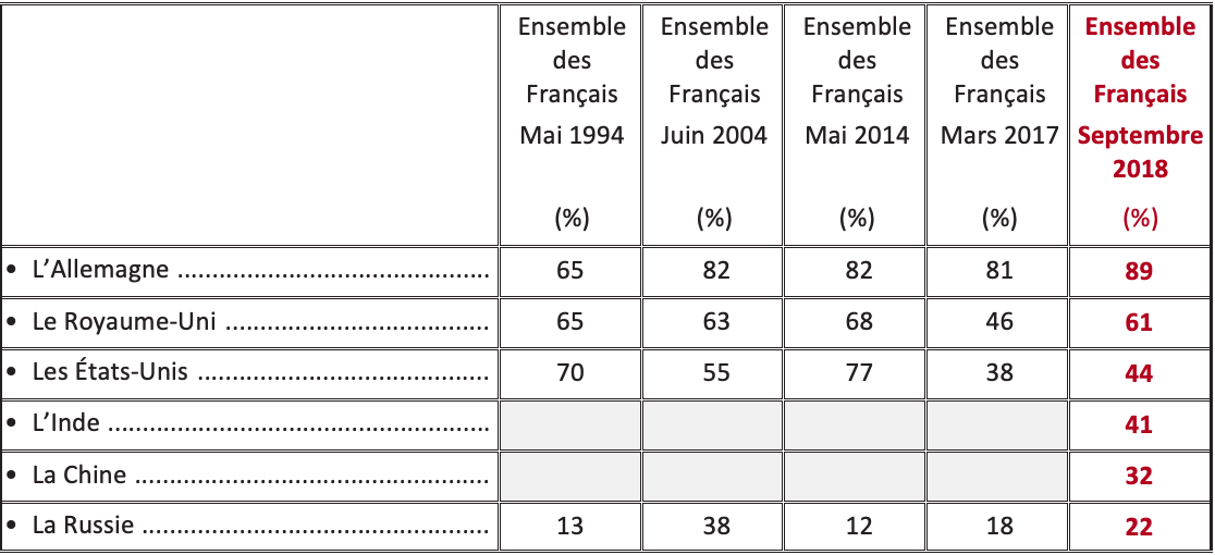 Plus que jamais, l’Allemagne est au regard des Français « un allié ou un payspartenaire sûr » (89%) contre 61% pour le Royaume-Uni et 44% pour les États-Unis. Jamais depuis 1994 le jugement des Français sur l’Allemagne n’avait été aussi favorable.
