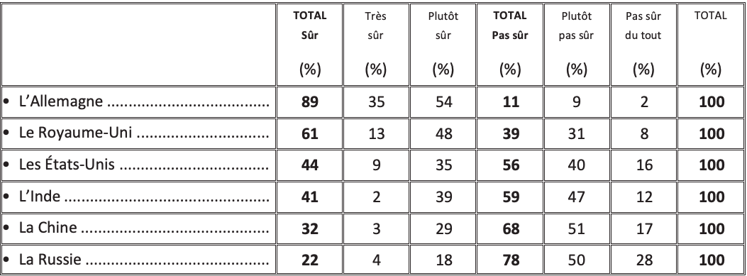 Enfin, s’agissant des puissances non-européennes, c’est l’Inde (41%) qui suscite le plus la confiance, devant la Chine (32%) et enfin la Russie (22%), qui arrive en dernière position.
