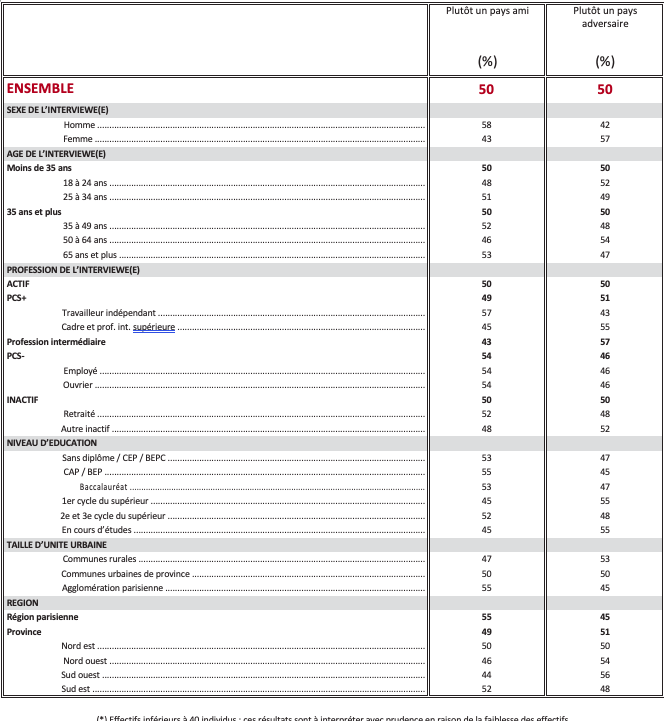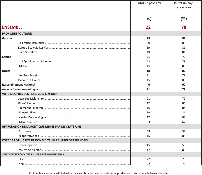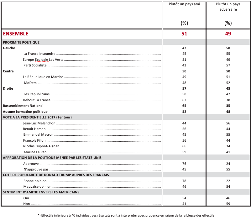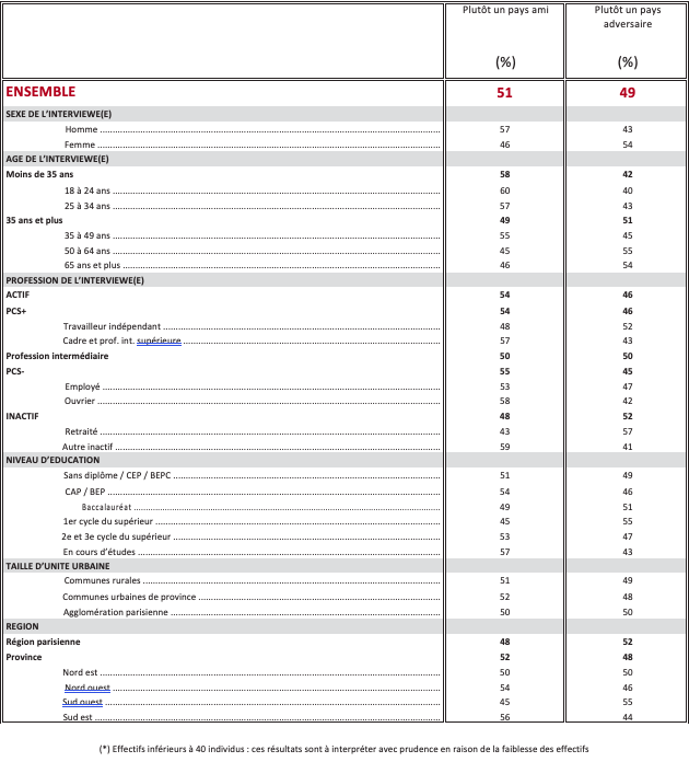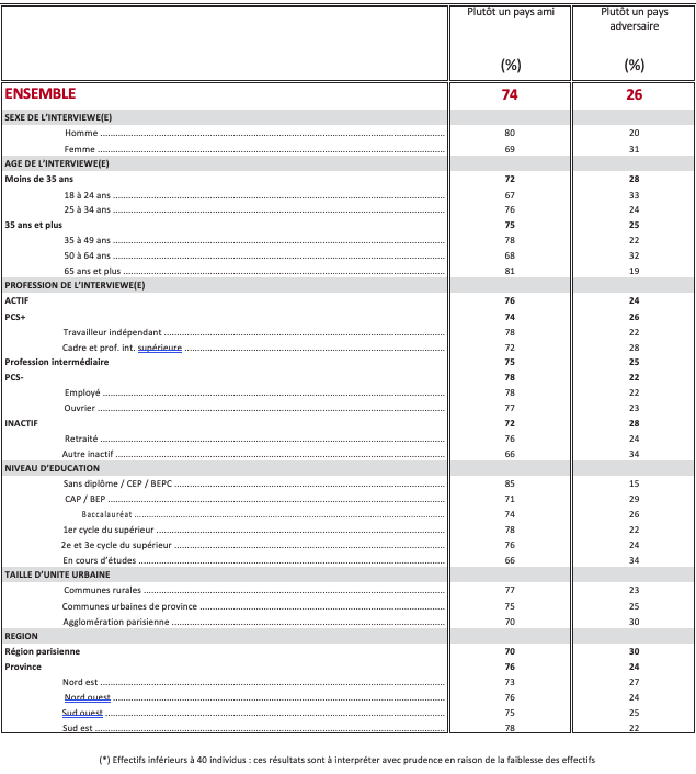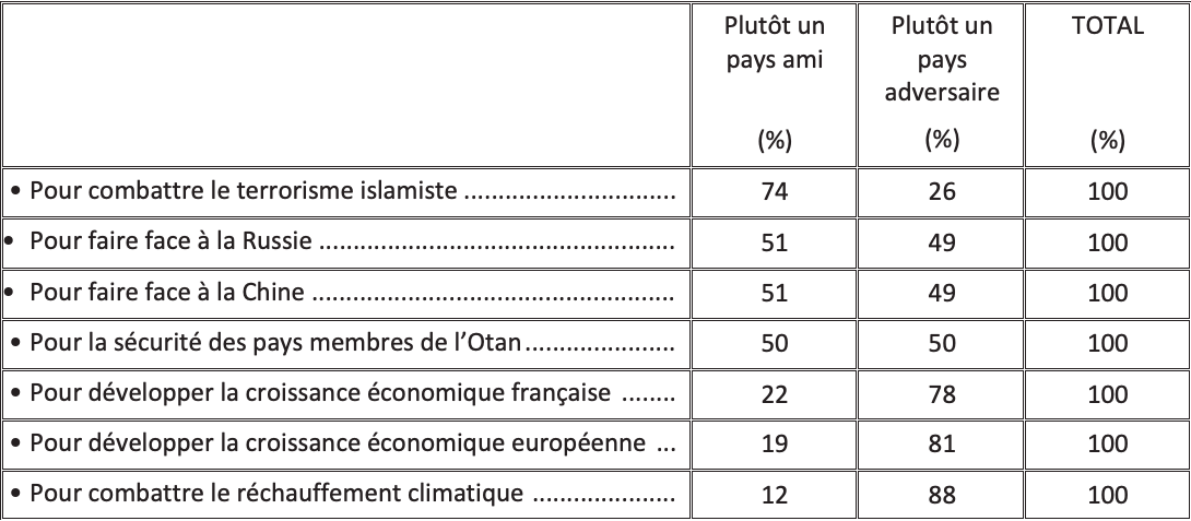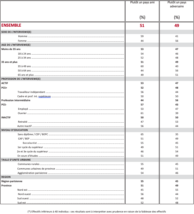 Les États-Unis sont considérés comme un pays ami en premier lieu pour combattre le terrorisme islamiste (74%). Pour faire face à la Russie, à peine plus d’un Français sur deux (51%) qualifient les États-Unis de pays ami, et 49% «d’adversaire » ! D’une manière générale, pour assurer la sécurité des pays membres de l’OTAN, 50% des Français regardent les États-Unis comme un pays ami, 50% comme un adversaire.