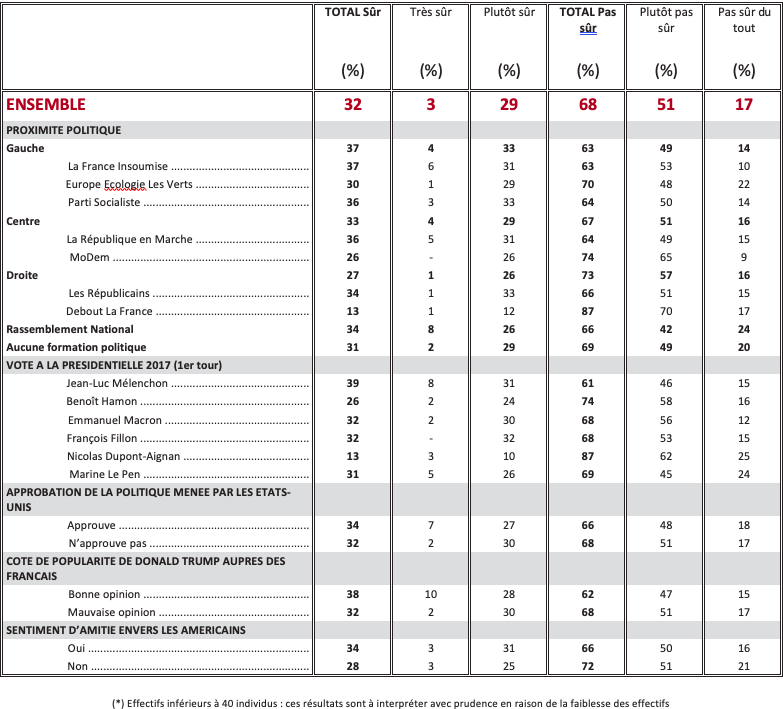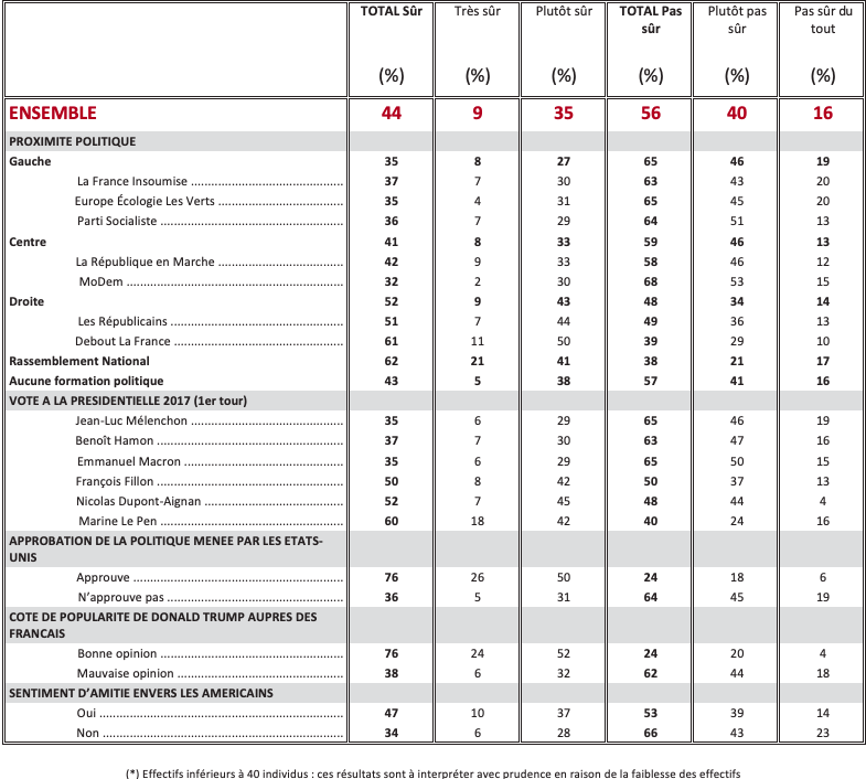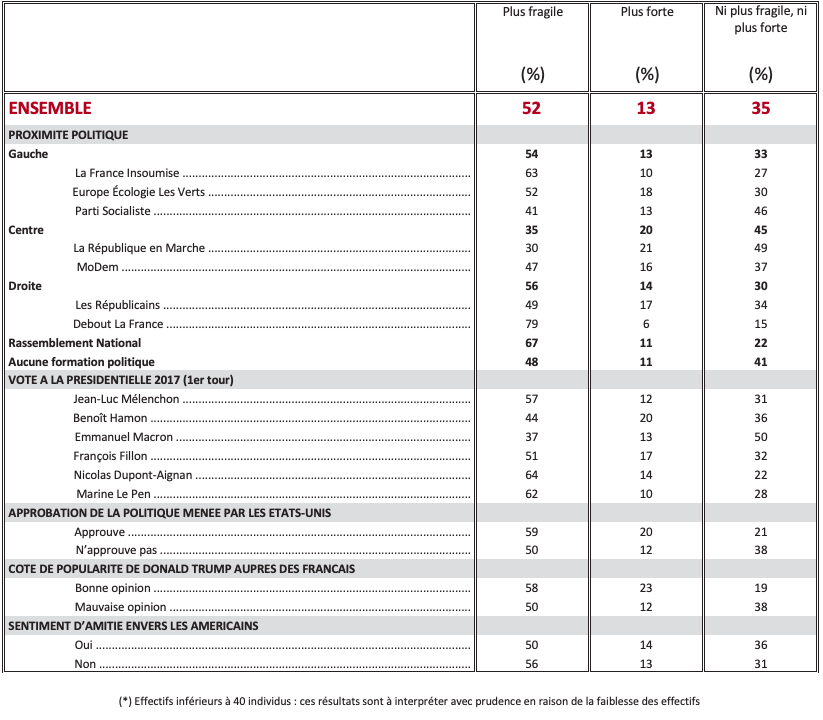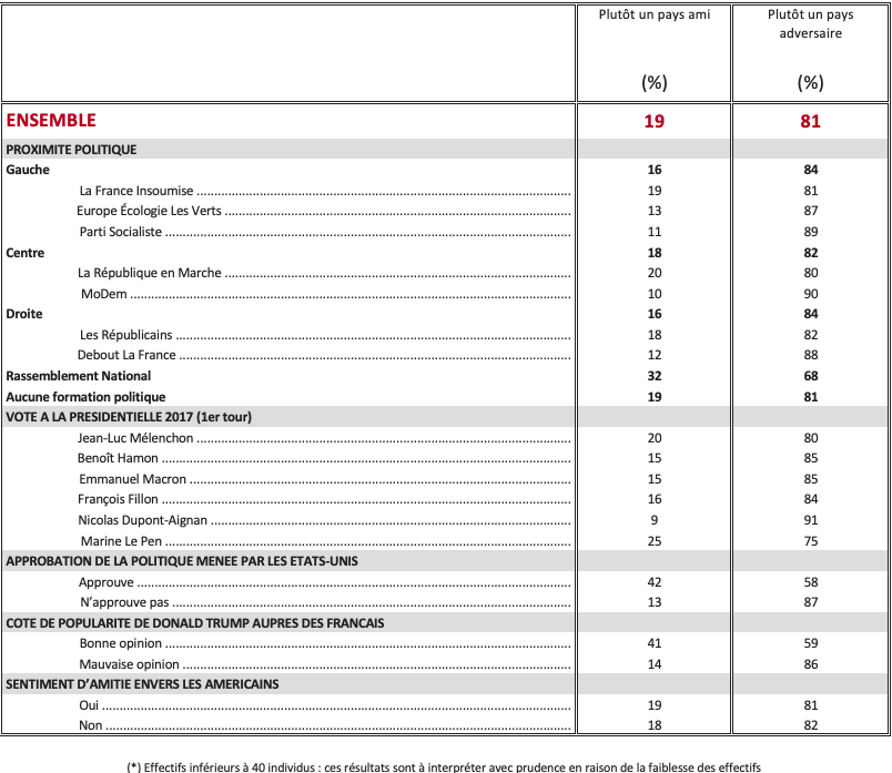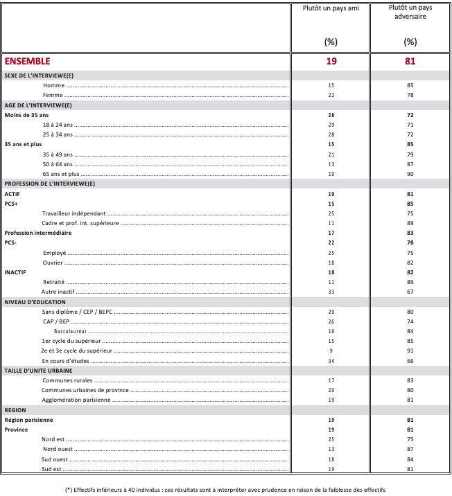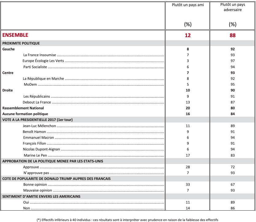 Les États-Unis sont considérés comme un pays ami en premier lieu pour combattre le terrorisme islamiste (74%). Pour faire face à la Russie, à peine plus d’un Français sur deux (51%) qualifient les États-Unis de pays ami, et 49% «d’adversaire » ! D’une manière générale, pour assurer la sécurité des pays membres de l’OTAN, 50% des Français regardent les États-Unis comme un pays ami, 50% comme un adversaire.