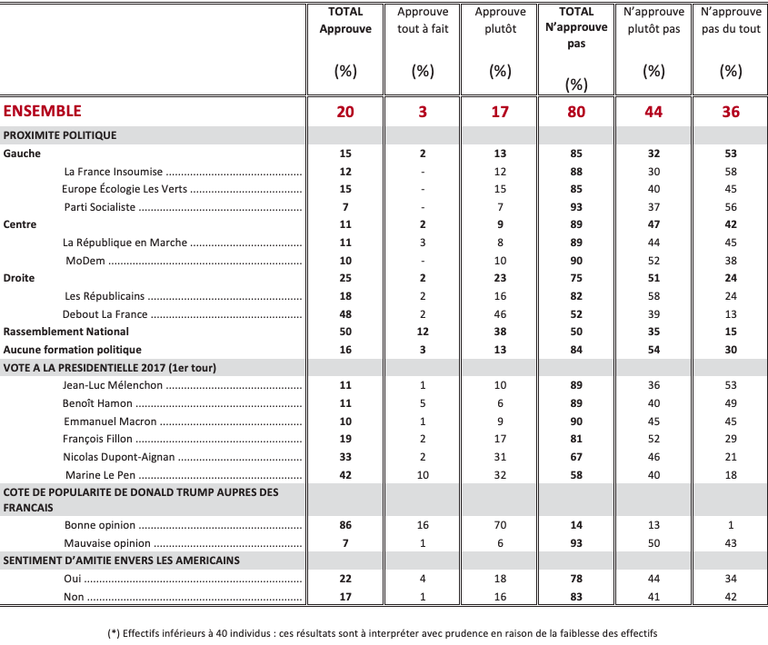Si une proportion significative de Français continue de considérer les États-Uniscomme un partenaire sûr (44%), les jugements menés sur la politique duPrésident américain suscitent une large désapprobation (80%). De même, notreenquête révèle que 83% des Français ont une mauvaise opinion de DonaldTrump comme président, mais qui est cependant en progression de huit pointspar rapport au lendemain de son élection (75%).