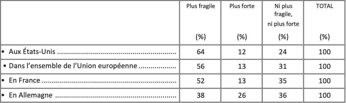 Selon l’opinion, en comparant la situation actuelle rapport à celle d’il y a quelques années, la démocratie apparaît plus fragile aux États-Unis (64%), dans l’ensemble de l’UE (56%), et en France (52%). Une forte minorité (38%) regardeégalement la démocratie allemande comme plus fragile.