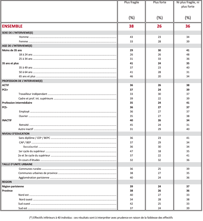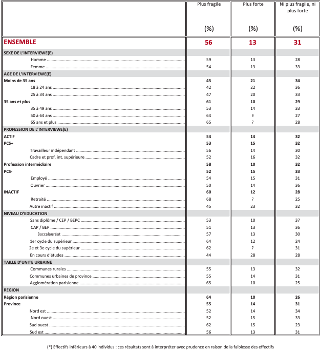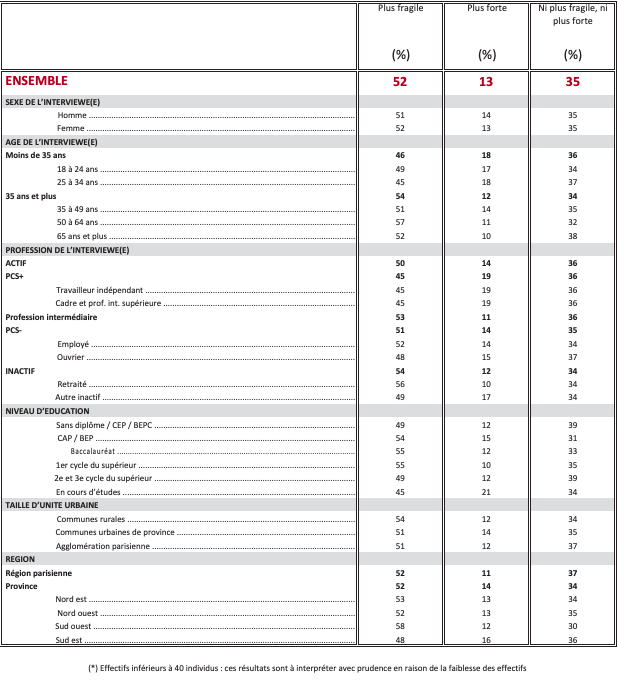 Question : Diriez-vous qu’aujourd’hui, par rapport à il y a quelques années, la démocratie est plus fragile, plus forte ou qu’elle n’est ni plus fragile ni plus forte dans chacun des pays ou ensembles territoriaux suivants ?