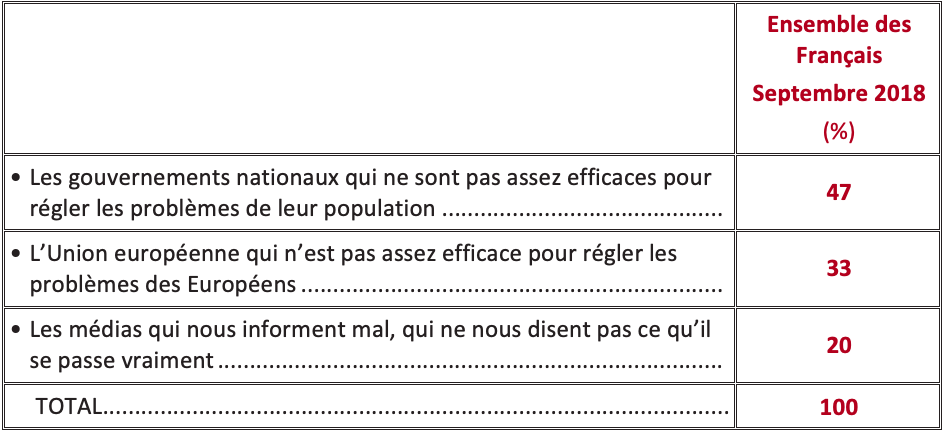 Question : Parmi les différents pouvoirs suivants, lequel est selon vous le plus responsable de la montée du populisme et de la protestation électorale (des votes protestataires) en Europe ?