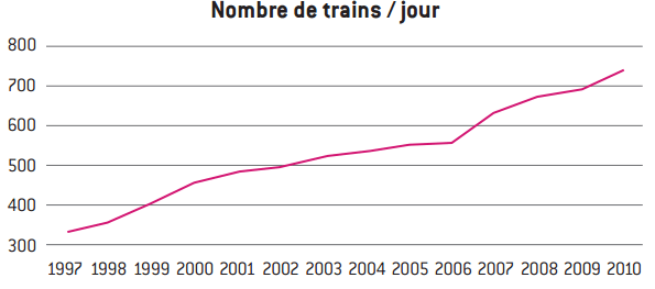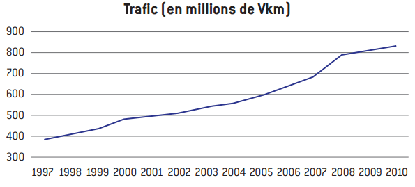 Évolution du nombre de voyageurs par kilomètres de 1997 à 2010