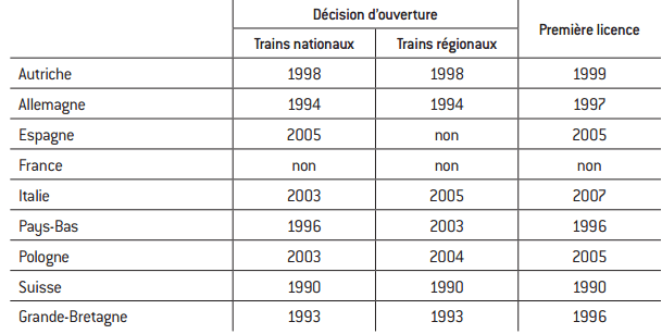 Contrairement à la France, la plupart des autres grands pays ferroviaires d’Europe ont tenu à anticiper la date limite d’ouverture à la concurrence du transport ferroviaire international puis national de passagers. S’y préparant, ils ont modifié leur gestion en conséquence afin de rester les premiers acteurs de leur marché national.