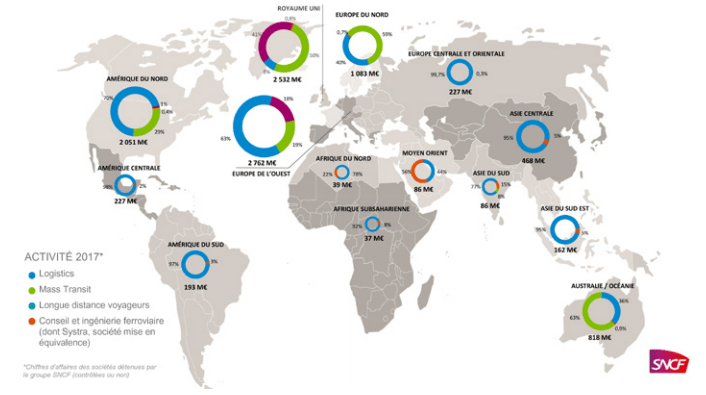 La SNCF est très implantée en Europe. Hors de France, elle y affiche un chiffre d’affaires de près de 6,6 milliards d’euros (2,5 milliards au seul Royaume-Uni). Elle est aussi très active en Amérique du Nord (plus de 2 milliards d’euros), Australie-Océanie (818 millions d’euros) et Asie centrale (468 millions d’euros). Enfin, près de 1,1 milliard d’euros de chiffre d’affaires est réalisé en Amérique du Sud, en Afrique et en Asie du Sud.