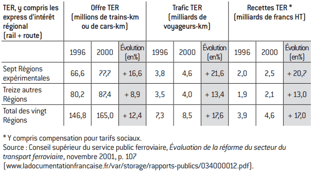 Le bilan de l’expérimentation étant largement positif – entre 1996 et 1999, le trafic augmenta de 12,1% et les recettes de 11,7% dans les régions expérimentales, contre respectivement 6,3% et 6,7% dans les autres régions –, elle fut généralisée à toutes les autres Régions par la loi SRU en 2000 (à l’exception de l’Île-de-France et de la Corse qui bénéficient de statuts particuliers).