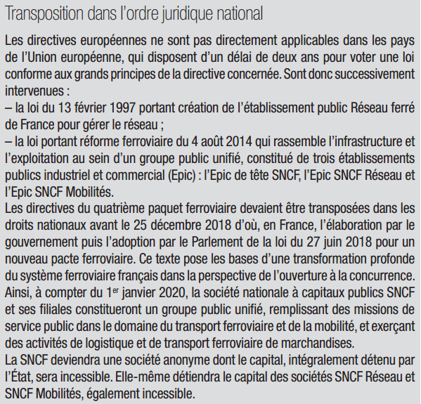 Comme on l’a vu plus haut, la France devant transposer avant le 25 décembre 2018 les directives du quatrième paquet ferroviaire sous peine de sanctions, une remise en cause du monopole légal s’imposait donc, et fut réalisée par la loi de juin 2018 pour un nouveau pacte ferroviaire.