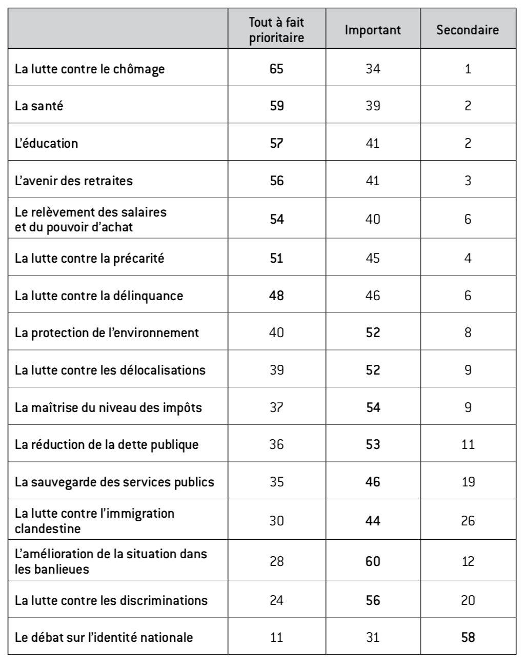 En cette période de crise très dure, l’emploi fait logiquement figure de principale urgence. Viennent ensuite, à des niveaux élevés, des sujets touchant à la vie quotidienne, comme la santé et l’éducation ou encore et toujours la question lancinante du relèvement des salaires et du pouvoir d’achat (que la crise n’a pas fait disparaître, loin s’en faut). La réduction de la dette publique arrive assez loin derrière. Tout se passe comme si cet enjeu revêtait une importance particulière sans pour autant passer pour