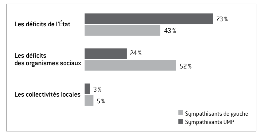Par-delà ce constat relativement partagé d’une situation dégradée de longue date pour des raisons structurelles et non liées à la conjoncture actuelle (qui ne ferait qu’aggraver les choses), le clivage gauche-droite réapparaît avec force quand il s’agit de diagnostiquer les causes et les ressorts de cet endettement et de ce déficit systémiques. Quand les sympathisants de gauche estiment très majoritairement que la dette publique de la France provient principalement des déficits de l’État, les sympathisants UMP incriminent d’abord les déficits des organismes sociaux.