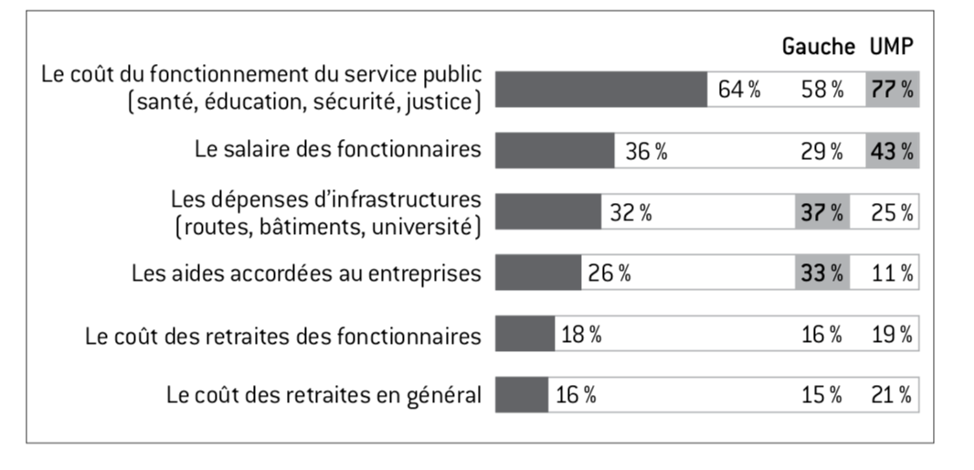 Assez logiquement, le coût du fonctionnement du service public arrive largement en tête, même s’il est plus cité à droite qu’à gauche. Les sympathisants UMP mentionnent également plus volontiers le salaire des fonctionnaires, ce qui peut laisser supposer qu’à leurs yeux ce poste de dépense mériterait d’être réduit. Les sympathisants de gauche, en revanche, évoquent plus fréquemment les dépenses d’infrastructures, mais également les aides accordées aux entreprises. Les résultats sont, à gauche, sur ces deux items, plus élevés que sur le salaire des fonctionnaires. La dépense publique est donc bien légitimée pour la gauche, en tant que synonyme d’investissements structurants permettant de préparer l’avenir. Mais elle est également fortement perçue par les électeurs de l’opposition comme étant la résultante d’une politique délibérée de «cadeaux» faits aux entreprises, choix sur lequel ils appellent à revenir, quand l’impact de cette politique d’aide aux entreprises sur les finances de l’État est beaucoup moins évident aux yeux des sympathisants de l’UMP.