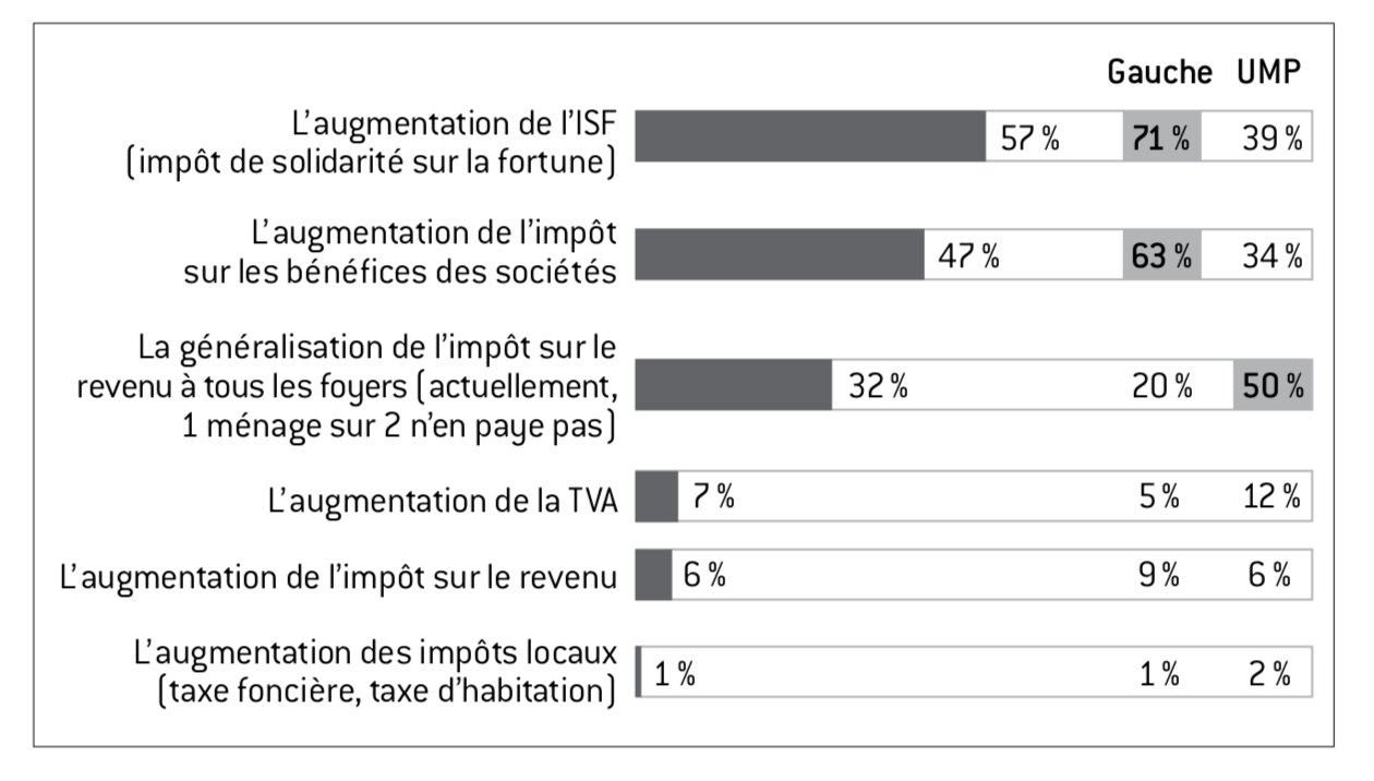 de l’ISF (71%) et de l’impôt sur le bénéfice des sociétés (63%), quand le premier choix des soutiens de l’UMP (50%) se porte sur la généralisation de l’impôt sur le revenu à tous les foyers. Les impôts à base beaucoup plus large, comme la TVA, l’impôt sur le revenu et, plus encore, les impôts locaux, sont, suivant ce même principe, très peu cités, alors que l’on peut penser que ce sont précisément ces types de levier qui seraient retenus par les pouvoirs publics en pareille situation.