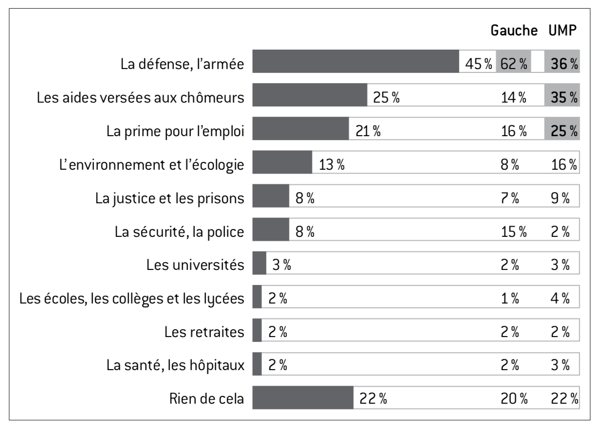 par exemple très favorables à ce que la France « touche les dividendes de la paix » à la suite de la chute du mur de Berlin au début des années 1990. Ce souhait est nettement plus répandu à gauche, mais la défense se classe également en première position des secteurs devant faire l’objet d’économies pour les sympathisants de l’UMP. Cette donnée pourra servir de point d’appui au gouvernement s’il décide de procéder de la sorte, ce qui n’est pas évident au vu des engagements répétés du président de la République vis-à-vis de la communauté militaire et du rôle joué par la hausse des commandes d’équipements des armées dans le plan de relance anticrise.