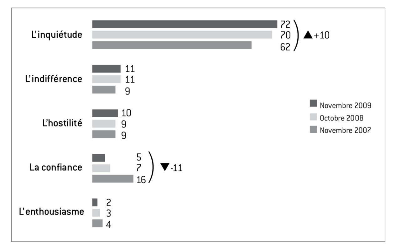 Les études qualitatives menées durant cette période auprès de l’électorat de la majorité montrent, de surcroît, que de fortes crispations s’expriment derrière cette relative adhésion, notamment parmi les retraités. Le grand emprunt leur fait souvent craindre une prochaine explosion de la dette publique et révèle, à leurs yeux, une certaine inconséquence de l’exécutif dans la façon de gérer la crise : « Le grand emprunt national, c’est négatif. Pour en arriver là, la France s’endette. Le PIB ne veut plus rien dire. En même temps, on nous demande de faire confiance, la dette explose, ils ne gèrent pas, c’est clair, c’est inconséquent, parce que le gouvernement ne mesure pas les conséquences du remboursement » (retraités, sympathisants UMP, novembre 2009).