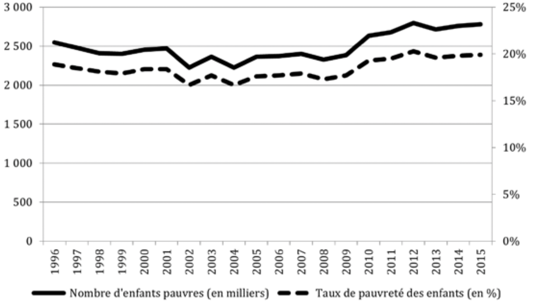 Si l’on regarde le graphique 1, les deux courbes du nombre et du taux d’enfants pauvres peuvent sembler, en première lecture, assez plates. Derrière cette impression rapide de faibles évolutions sur une vingtaine d’années, il faut tout de même souligner une reprise significative à la hausse sur une dizaine d’années : entre 2004, le point le plus bas, et 2015, ce sont 500.000 enfants pauvres comptabilisés en plus. Sur la même période, le taux de pauvreté infantile est passé d’environ 17 à 20%. La croissance statistique du phénomène s’accompagne d’une aggravation du problème. En effet, en 2015, 44% des enfants pauvres vivent dans un ménage où aucun adulte ne travaille. C’était le cas d’un tiers d’entre eux au milieu des années 2000.
