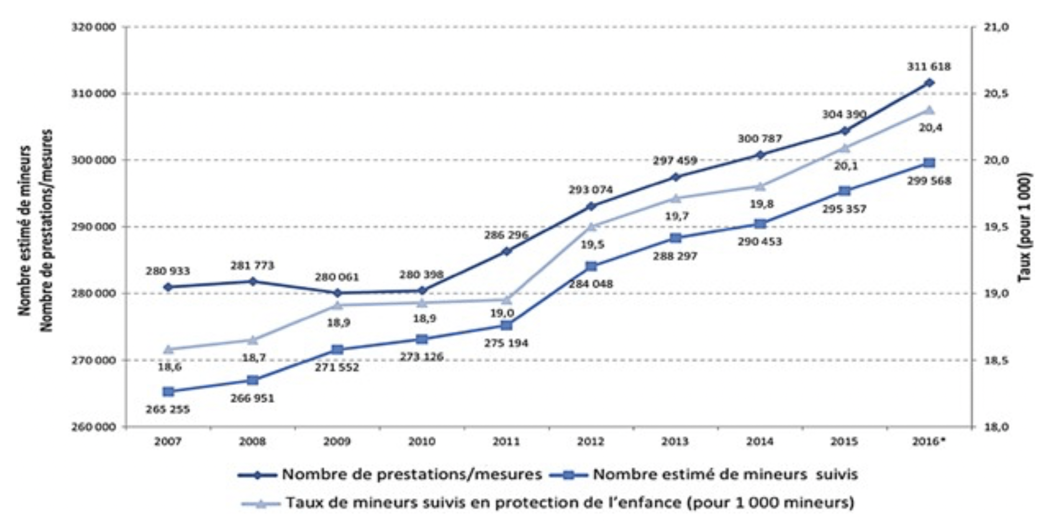 Graphique 2 : Évolution des prises en charge des mineurs en protection de l’enfance (au 31 décembre 2016)