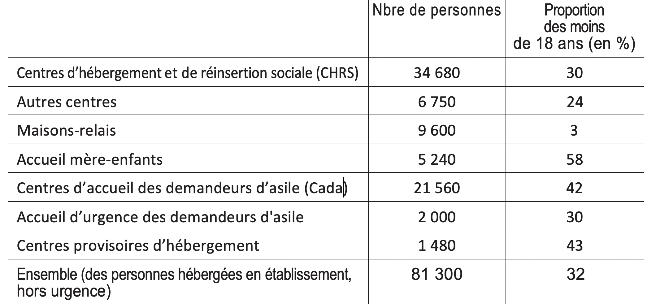 L’enquête « Établissement sociaux “difficulté sociale” », réalisée par la Drees, s’intéresse à l’activité des établissements et services pour personnes en difficulté sociale, au personnel en fonction et au profil des personnes accueillies dans ces structures (hors urgence, hors nuitées hôtelières) : enfants et adolescents, d’une part ; adultes et familles, d’autre part22. En 2012, plus de 81.000 personnes sans logement étaient accueillies en établissements (hors urgence). Un tiers, soit plus de 25.000, étaient mineures. Mais les chiffres, sur fond de crise migratoire, ont largement augmenté depuis, notamment avec le développement des Centres d’accueil de demandeurs d’asile (Cada).