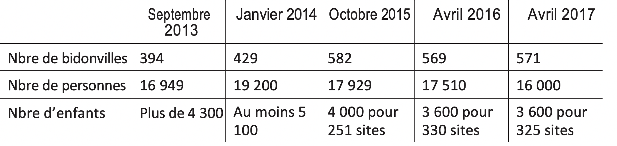 Lecture : en 2017, on compte 3.600 enfants pour 325 bidonvilles. On ne saurait, en toute rigueur, extrapoler ce chiffre pour l’ensemble des 571 bidonvilles recensés.