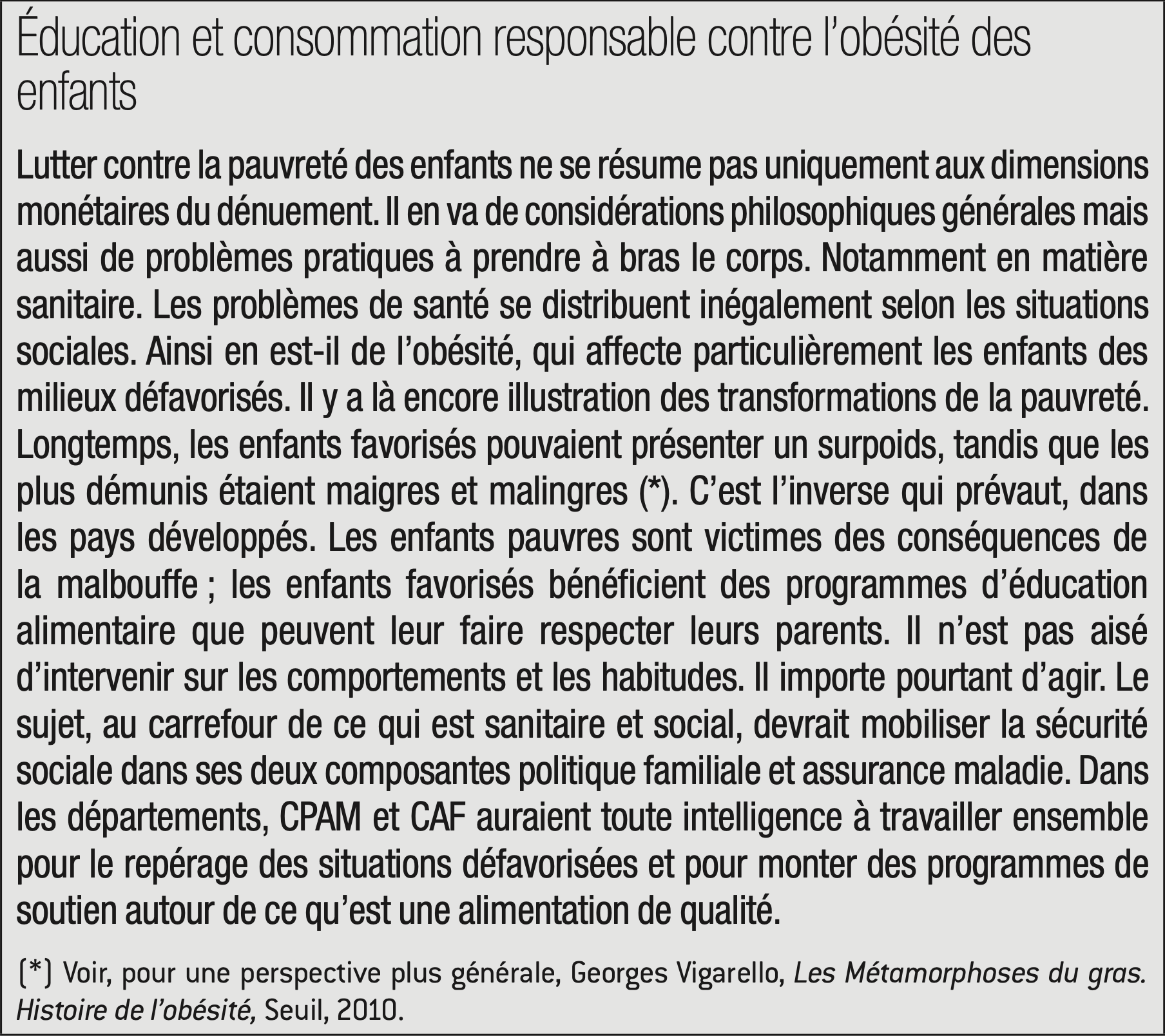 En se centrant sur la pauvreté des enfants, l’action publique se donne une juste cible. Trois dimensions incarnent ce possible nouvel agenda voulu par les pouvoirs publics. Tout d’abord, le gouvernement se refuse à annoncer un énième plan Marshall ou une énième grande loi contre les exclusions. Plutôt que d’imaginer de nouveaux dispositifs venant s’ajouter à l’entrelacs de mesures déjà très sophistiquées, il s’agit de concentrer les moyens sur un objectif : réduire la pauvreté infantile. Ensuite, toujours dans la méthode, l’État a organisé une concertation avec les opérateurs publics (les collectivités locales au premier rang) et privés (les associations). Là aussi, ni nouveau Grenelle ni « usine à gaz » mais plutôt de la discussion d’abord et ensuite de la négociation, qui sera assurément compliquée, pour adapter et paramétrer le secteur de la lutte contre la pauvreté. Troisième dimension : pas de gadgets, mais des inflexions structurantes. En un demi-siècle, avec son système de retraites, la France a presque éradiqué la pauvreté des personnes âgées. Il demeure des situations intolérables, avec, par exemple, plus d’un demi-million de retraités au minimum vieillesse. Mais le sujet de la pauvreté s’est transformé, basculant vers les plus jeunes. Aussi, c’est bien par des réformes des prestations sociales et familiales que tout se joue. Les décisions récentes (ponction autoritaire des allocations logement) ou envisagées avant d’être remisées (mise sous condition de ressources des allocations familiales) ne sont pas forcément les meilleures. D’autres idées matérialisent la priorité aux enfants pauvres. Le gouvernement aspire à investir dans les crèches. Il n’est pas le seul à y avoir pensé. Il faut le faire massivement en reconfigurant la politique familiale. Celle-ci doit s’adapter aux familles et problématiques contemporaines qui relèvent davantage d’un souci de conciliation entre vie familiale et vie professionnelle que d’une préoccupation nataliste. Le gouvernement veut également aller dans le sens d’un « versement social unique ». Il faut, en effet, prendre à bras-le-corps la complexité d’un système auquel plus personne ne comprend grand-chose. Réduire la pauvreté, c’est, entre autres, réduire la complexité de la lutte contre la pauvreté. C’est aussi innover. S’il faut revoir les paramètres et barèmes des prestations sociales et des dépenses fiscales, il faut également changer dans la manière de traiter les problèmes, par exemple en rapprochant les dispositifs sociaux et les dispositifs sanitaires. En l’espèce, la question de l’obésité, en lien avec la pauvreté, appelle à innover.