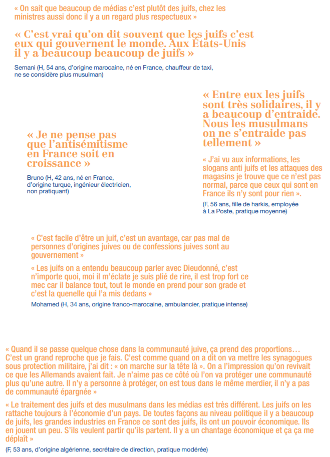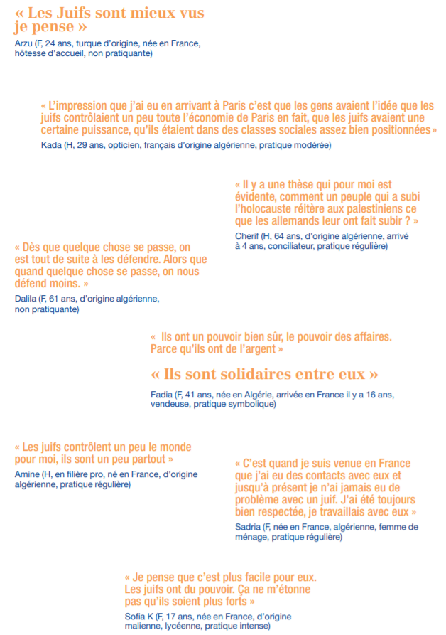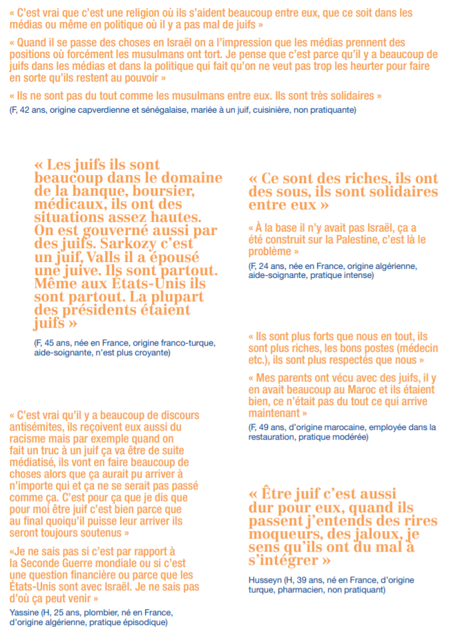 « Quand je parle avec des personnes différentes, chaque fois, c’est les mêmes choses qui reviennent : “Ils sont partout.” » La mère de l’interviewé affirme de son côté lors du même entretien : « Les juifs contrôlent un peu le monde, pour moi ils sont un peu partout. Je ne dis pas que c’est tous les juifs, il y a des juifs que je côtoie, je marche avec eux, mais il y en a franchement comment ils pensent… » (H, lycéen en électrotechnique, né en France, originaire d’Algérie, pratique épisodique).