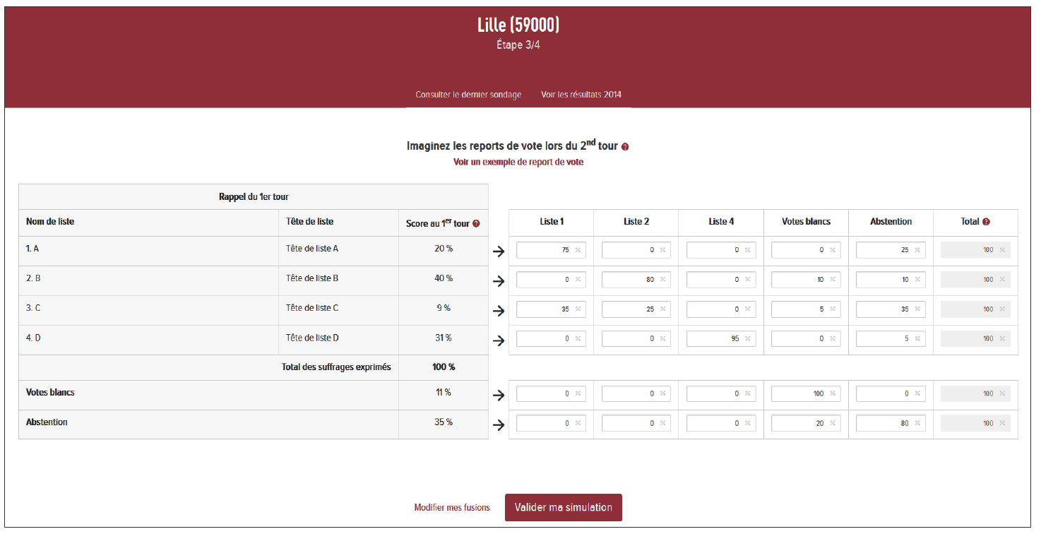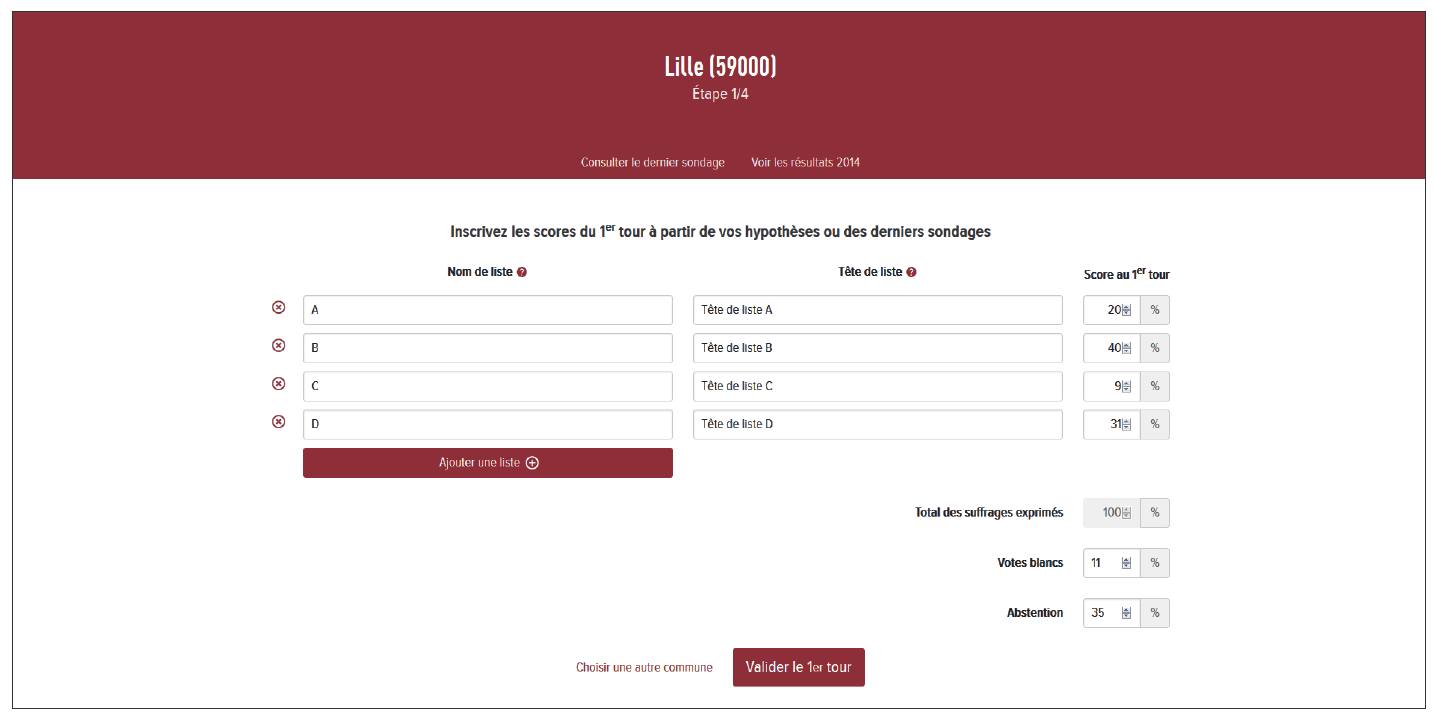 Dans un premier temps, vous êtes invité à sélectionner la commune dans laquelle vous souhaitez réaliser une simulation électorale. Dans cette commune, vous devez indiquer quelles seront les listes candidates ainsi que leurs têtes de liste et leurs scores au 1er tour. Bien entendu, pour la validité de vos hypothèses, le total des scores doit atteindre 10% des suffrages exprimés. Vous devez également décider du pourcentage du vote blanc et de l’abstention et l’inscrire même si vous estimez qu’il est égal à 0%. Cette étape peut être fondée sur des hypothèses personnelles ou sur des sondages. Vous pouvez aussi, si vous le voulez, imaginer les évolutions depuis les élections municipales de 2014 dont les résultats sont rappelés par lien « Voir les résultats 2014 » situé sous le nom de la commune choisie.