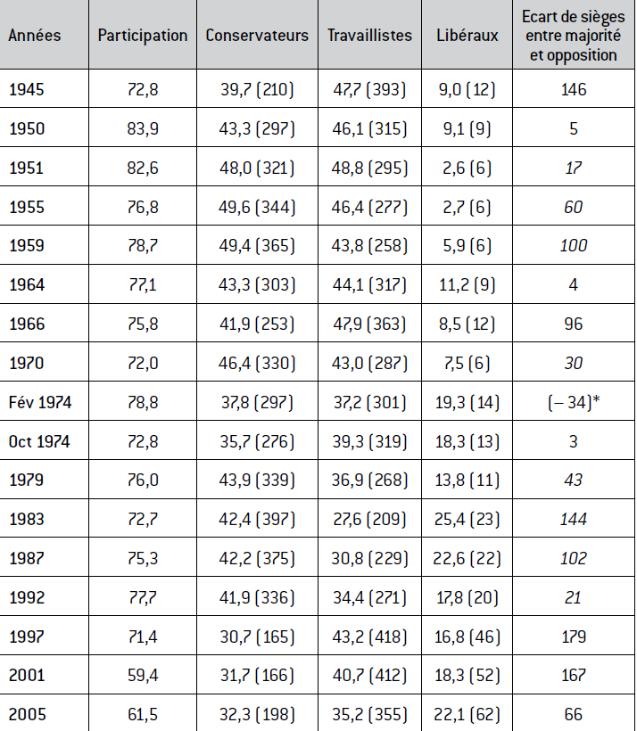 Tableau 1 : Les élections générales britanniques depuis 1945.