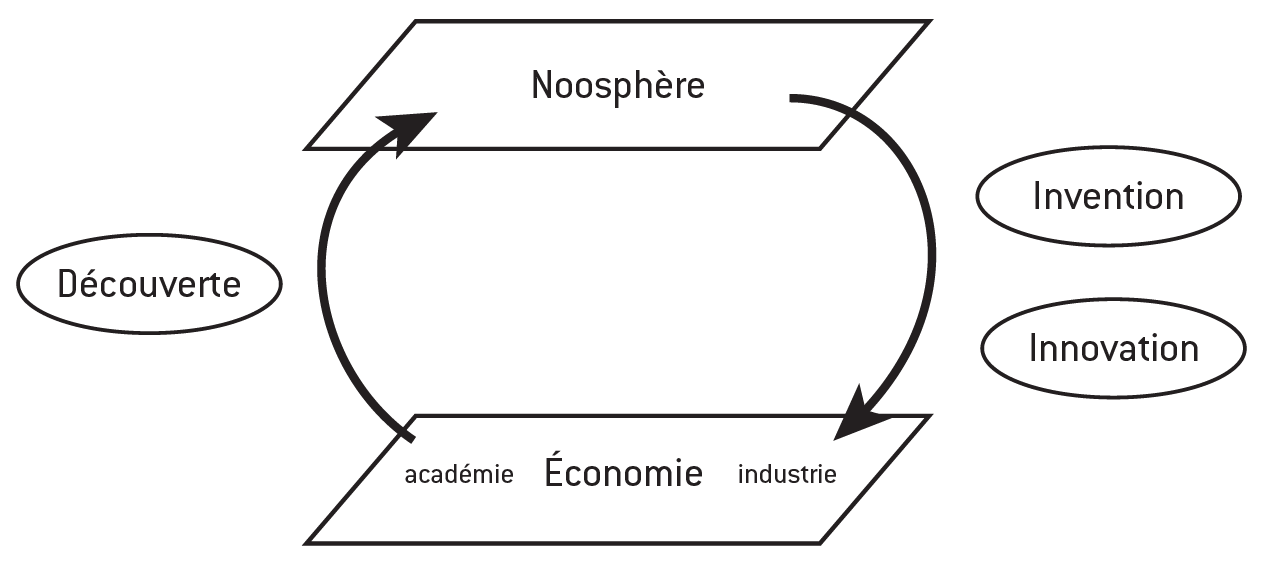 Le cycle R&D de la nooéconomie est comparable au cycle de l’eau : la recherche fait s’évaporer des découvertes dans la noosphère, qui se précipitent ensuite dans l’industrie à travers deux états : l’invention et l’innovation.