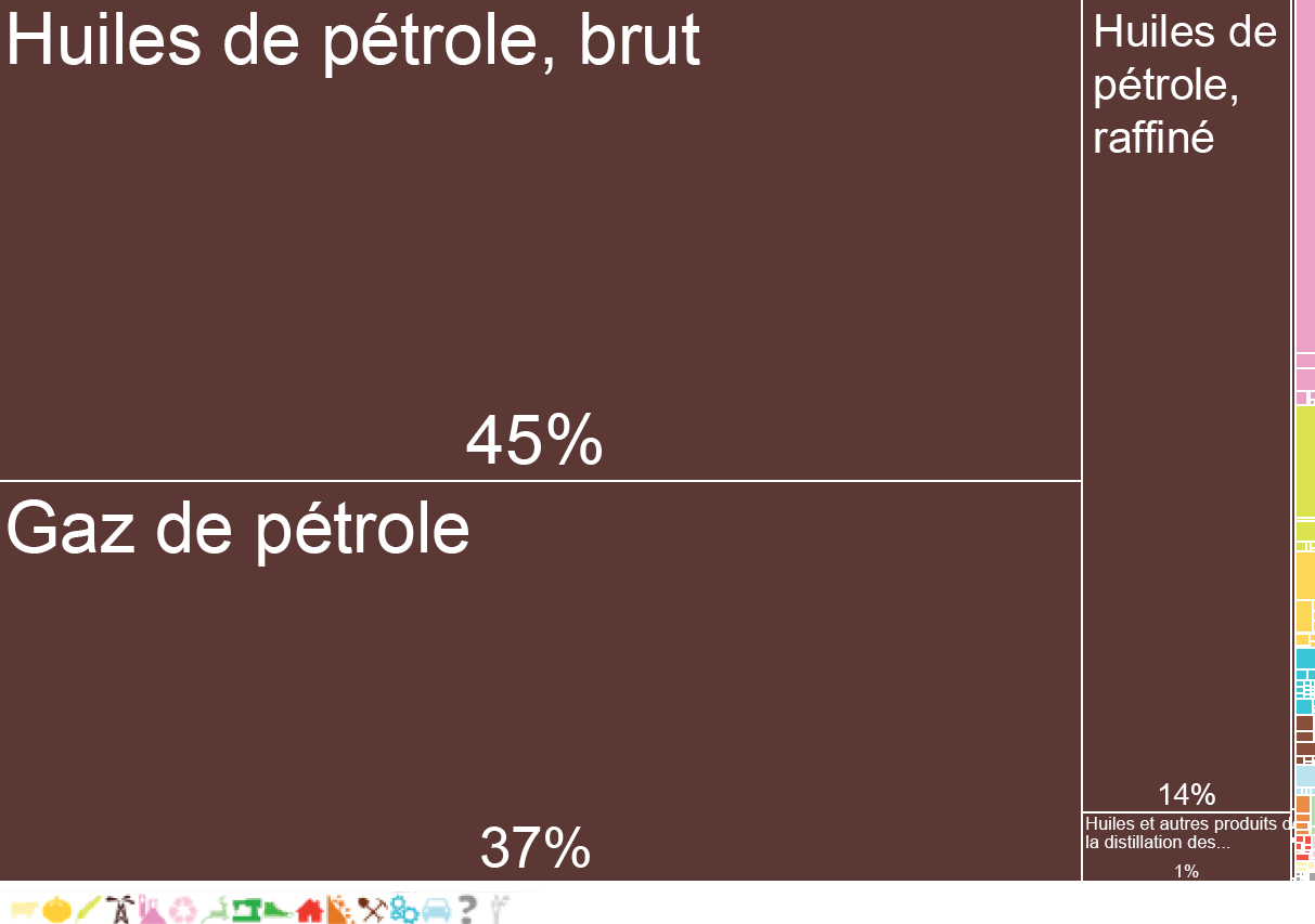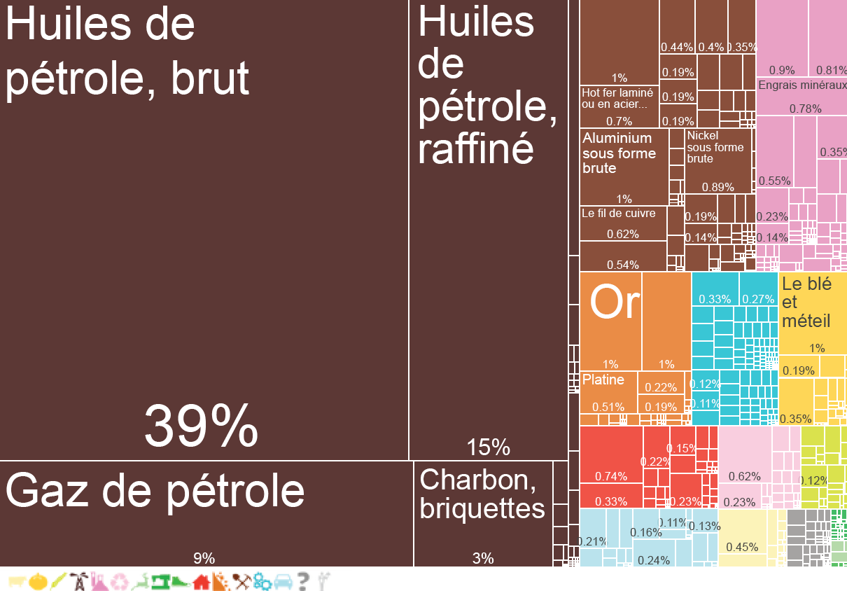 commentaire : Noter que le volume global est supérieur à celui de la Fédération de Russie, et que la proportion des exports technologiques y est bien supérieure également. La part d’hydrocarbures et de produits miniers représente davantage les produits circulants et transformés que les produits extraits sur place.