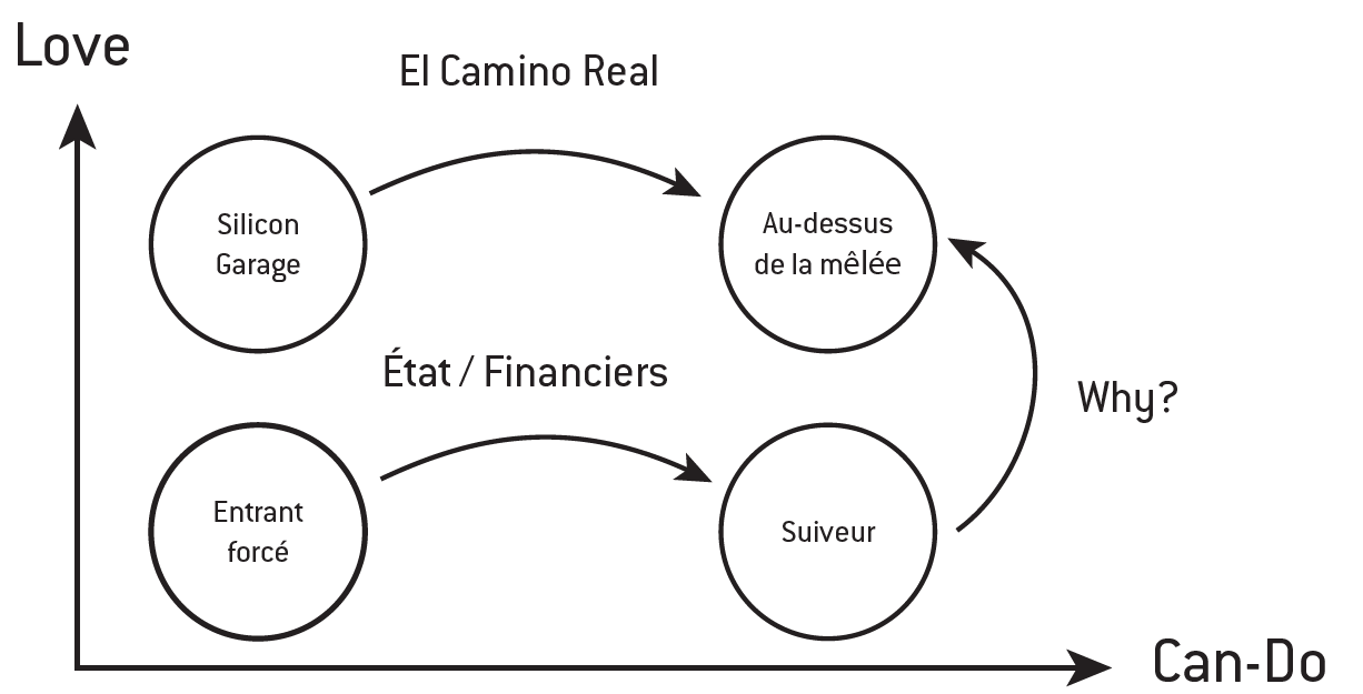 La transition de l’entrant forcé au suiveur est invariablement le résultat d’une contrainte externe : le choix d’un État ou d’un investisseur financier qui ne connaît rien au métier et n’y investit que parce que le marché est là. Enfin, le passage du garage au leadership mondial, à l’instar d’Apple, Google ou Amazon, se fait quand l’acquisition de l’expertise est avant tout motivée par la passion et par rien d’autre : pas par une note, pas par un salaire, pas par un vain prix régional ou municipal, pas par l’attention artificielle d’un incubateur qui infantilise l’entrepreneur, pas par les lauriers d’un ministère en mal de communication ou d’un quelconque «pôle de compétitivité», mais par le seul amour du métier. Un tel entrepreneur suit ce que j’appelle «la voie royale», du nom du boulevard de la Silicon Valley, El Camino Real.