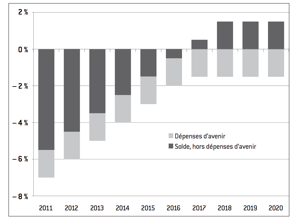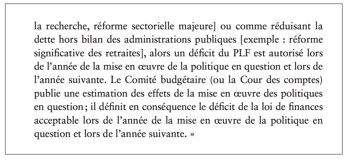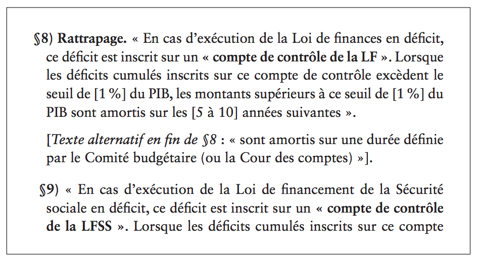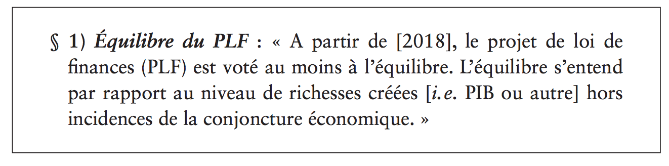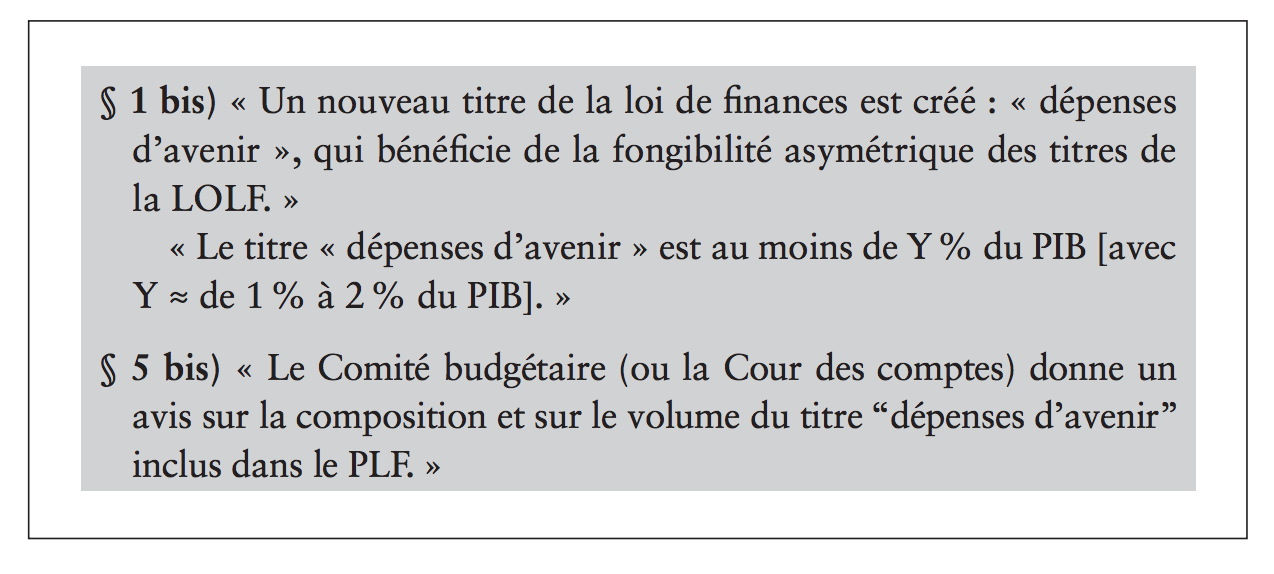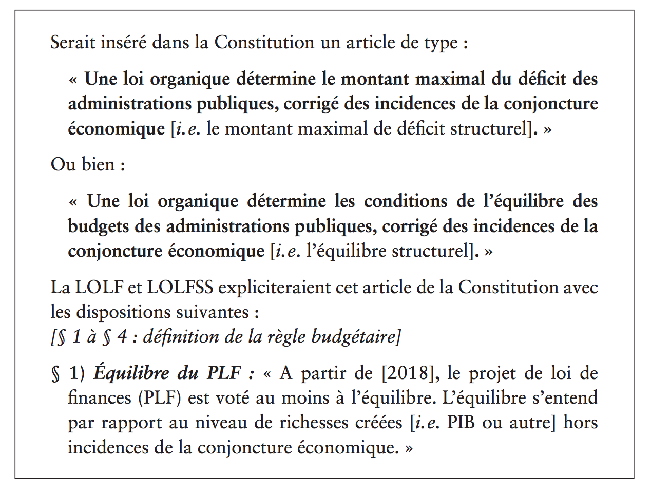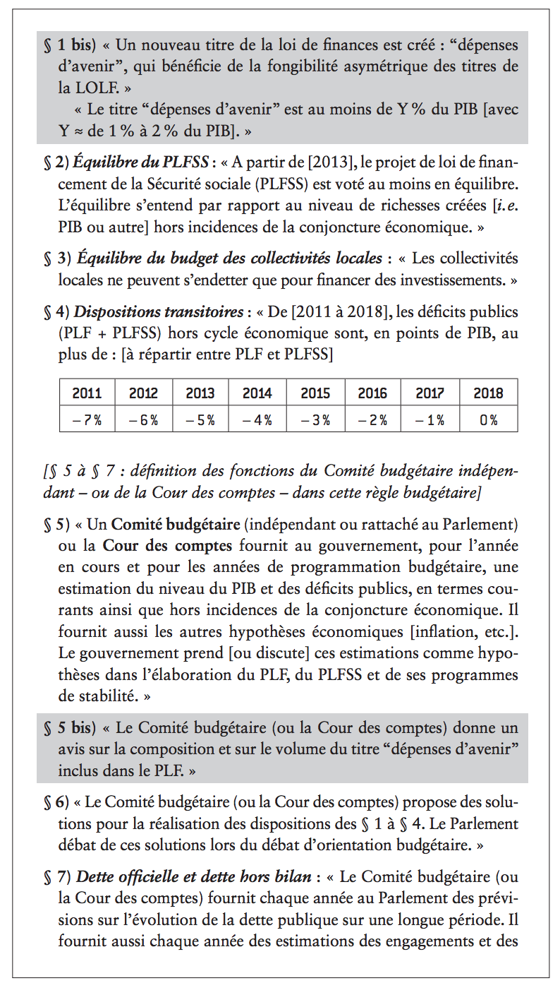 - Obligation constitutionnelle d’équilibre budgétaire (hors cycle) pour le projet de loi de finances (PLF) à partir de 2018, avec réduction graduelle des déficits à partir de 2011. Une variante de la règle propose en plus de sanctuariser les « dépenses d’avenir » et les « dépenses climat » (à hauteur de 1% à 2% du PIB), sans altérer l’obligation d’équilibre budgétaire.