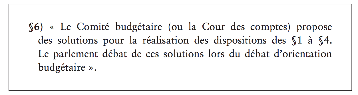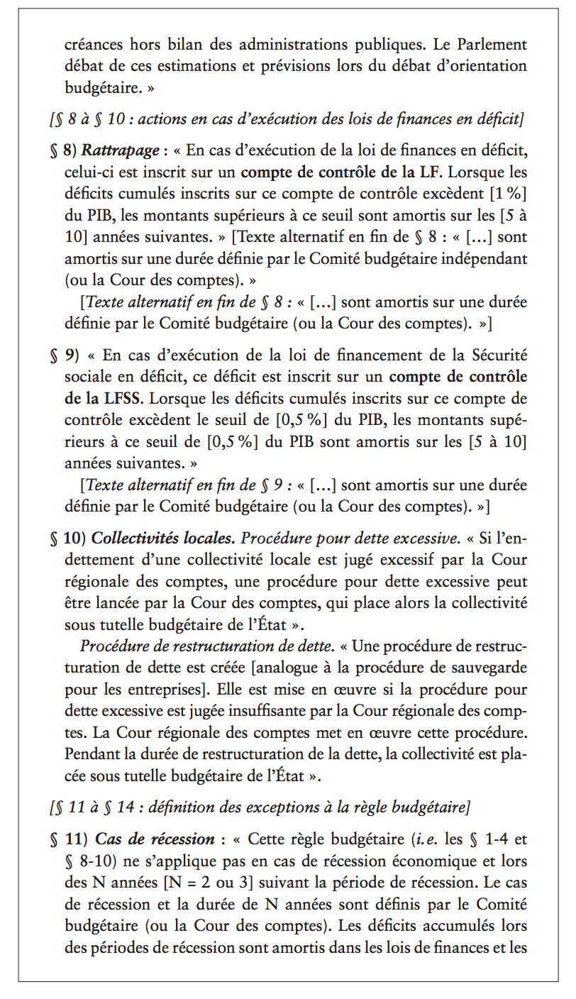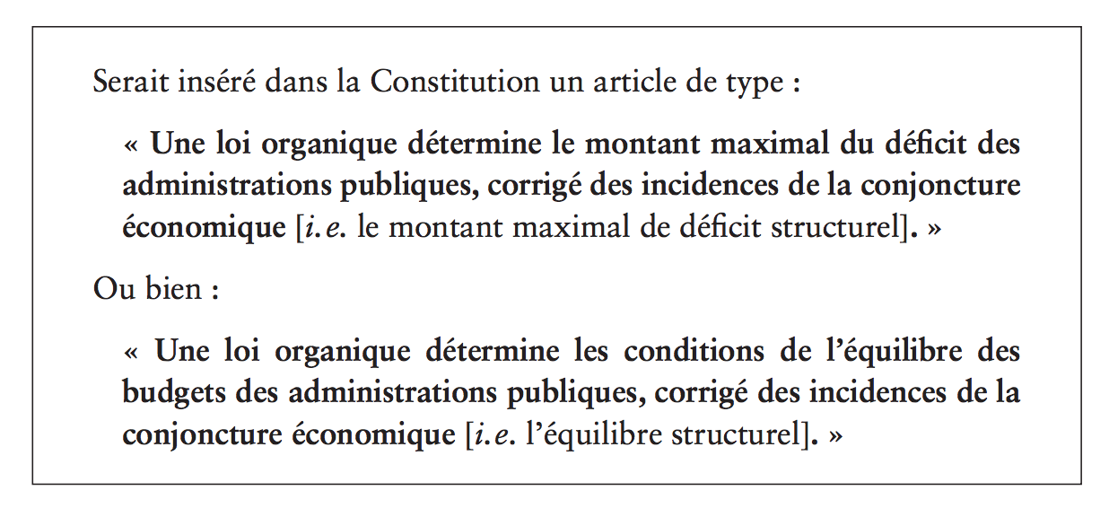 Dans la Constitution ? Seule une modification de la Constitution permettrait de limiter les pouvoirs futurs du Parlement à voter des déficits aussi importants qu’il le veut. Les Allemands ont inscrit l’ensemble de leur règle budgétaire (y compris les détails) dans leur Constitution (Loi fondamentale). En France, il n’est pas usuel d’inscrire dans la Constitution de tels détails; la Constitution définit seulement les grands principes et les équilibres des pouvoirs. Nous proposons donc ici une modification brève de la Constitution, qui, telle une accroche, définit le principe de la contrainte imposée au Parlement. Les détails de la règle budgétaire sont renvoyés à une loi organique, qui modifiera l’actuelle LOLF.