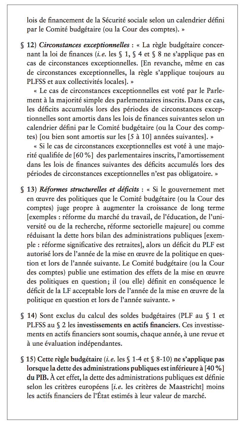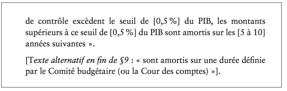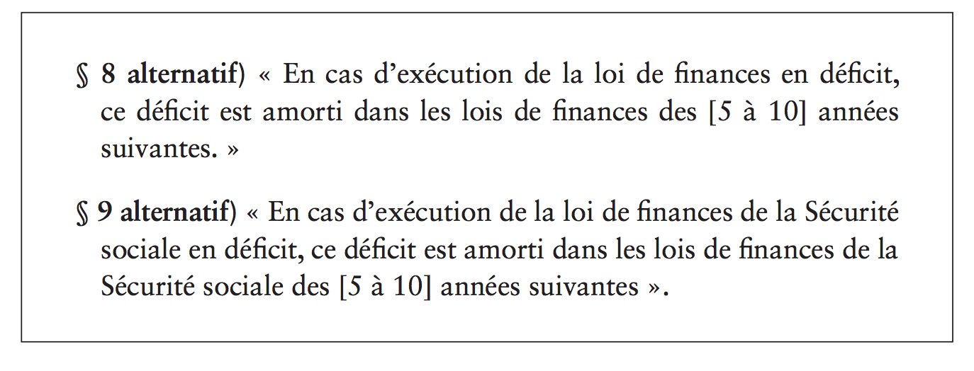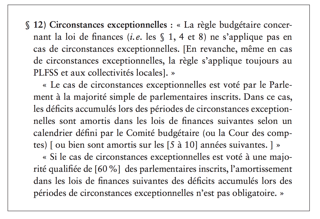 • Réduire l’impact du recours aux circonstances exceptionnelles (qui demeure voté à la majorité simple mais sur la base de l’ensemble des députés inscrits, ce qui force à mobiliser l’ensemble des députés de la majorité) en en réduisant le coût budgétaire. C’est l’option qu’ont choisie les Allemands : les déficits créés lors de la période exceptionnelle doivent être amortis après celle-ci. Cette option est reprise dans le premier cas du § 12 ci-dessus.