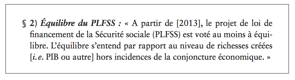 - Obligation constitutionnelle d’équilibre budgétaire (hors cycle) pour le projet de loi de financement de la Sécurité sociale (PLFSS) à partir de 2013.