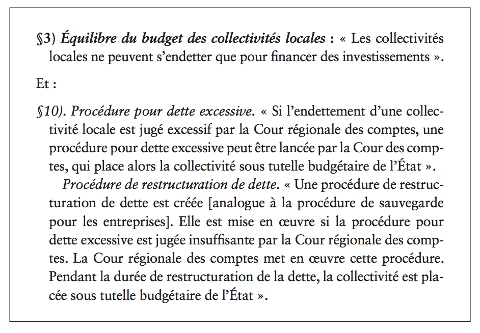 Procédure de restructuration de dette. Dans un second temps, il est introduit une procédure de quasi-faillite des collectivités locales, qui autorise une restructuration de la dette des collectivités locales (avec donc abandon de créances de la part des banques sous condition de réforme drastique du budget de la collectivité) en cas d’endettement impossible à surmonter. Une procédure analogue existe depuis peu en France pour les entreprises (sauvegarde). Aux États-Unis la faillite des collectivités locales existe depuis longtemps (Chapter 9 du United States Bankruptcy Code), utilisé pour Orange County en 1994-95). Il s’agit ici de donner de bonnes incitations ex ante aux banquiers, afin qu’ils ne prêtent pas de manière irresponsable aux collectivités locales. NB : les communes représentent 55% des dépenses des collectivités locales, contre 29% pour les départements et 16% pour les régions.
