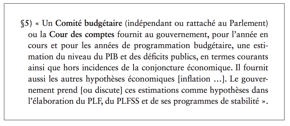Le Comité budgétaire indépendant : son indépendance lui évite de subir des pressions du gouvernement pour embellir ses prévisions. Ses membres doivent être crédibles et expérimentés. Ils ne doivent pas travailler pour le gouvernement dans les [2] ans après leur sortie du Comité. Il serait bien pour leur visibilité et leur crédibilité qu’ils soient confirmés par le parlement. Idéalement, il y aurait : des macro-économistes, des spécialistes de finances publiques et de fiscalité, le DG de l’INSEE, un ancien ministre des finances de l’opposition et un de la majorité, des étrangers (économistes ou anciens ministres des finances). En Allemagne. La récente réforme a fait de l’Institut national de statistiques de Wiesbaden le fournisseur des chiffres utilisés par la règle budgétaire. En France, il ne serait pas bon de confier à l’INSEE cette tâche. L’INSEE doit être vu comme un fournisseur de statistiques compétent, indépendant et de bonne foi et non comme un acteur du processus budgétaire ; lui demander de fournir les hypothèses du PLF et PLFSS risque de dégrader le jugement que portent les utilisateurs de ses statistiques sur son indépendance. En Suède, le Comité budgétaire indépendant ne fait que de l’évaluation7, mais c’est après 10 ans d’excédents budgétaires substantiels (de +1,2% du PIB sur 1996-2007) et avec une dette publique estimée à 44% du PIB en 2010.