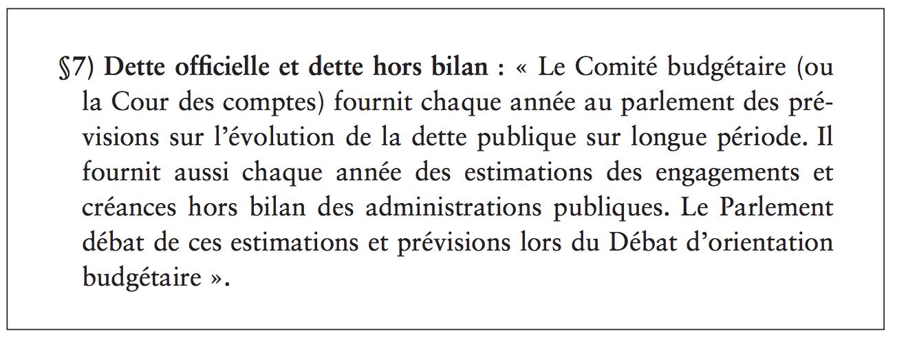 Aujourd’hui le débat budgétaire est trop centré sur l’année N+1 (avec le PLF) et aborde à peine les quatre années suivantes N+2 à N+4 (avec les programmes de stabilité). En outre, le débat est trop focalisé sur les scénarios proposés par le gouvernement. Avec le §6, le Comité animera le débat sur la réduction de la dette (et les politiques à suivre) avec une vision de longue période (il faut 15 à 20 ans pour réduire la dette sensiblement en dessous de 60% du PIB) et avec de multiples hypothèses, y compris celles qui déplaisent au gouvernement8. Il s’agit aussi de mesurer et de mettre dans le débat public l’ampleur de la dette hors bilan de l’État (constitué surtout par les retraites).9