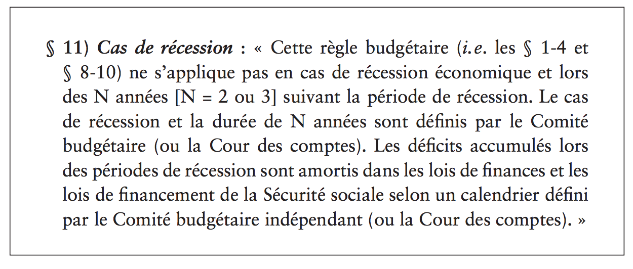 La règle budgétaire ne s’applique évidemment pas en cas de récession (alors qu’elle s’applique en phase basse du cycle économique). Comme il n’y a pas de définition ex ante précise de ce qu’est une récession, il vaut mieux déléguer le déclenchement du cas de récession au Comité budgétaire indépendant13, qui recueillera les avis des autres pays européens, de la Commission européenne14 et autres institutions (OCDE, FMI,marchés…). Pour la crédibilité de la règle, il ne faut pas que le cas de récession soit déterminé par le gouvernement, qui serait en l’occurrence juge et partie. L’obligation d’équilibre budgétaire ne s’applique pas non plus aux N années (N = 2 ou 3 probablement) après une récession afin de permettre une réduction graduelle des déficits post-récession et un redressement graduel des finances publiques. Le Comité budgétaire indépendant définit N; il a de meilleures informations pour juger qu’une durée standard définie ex ante.