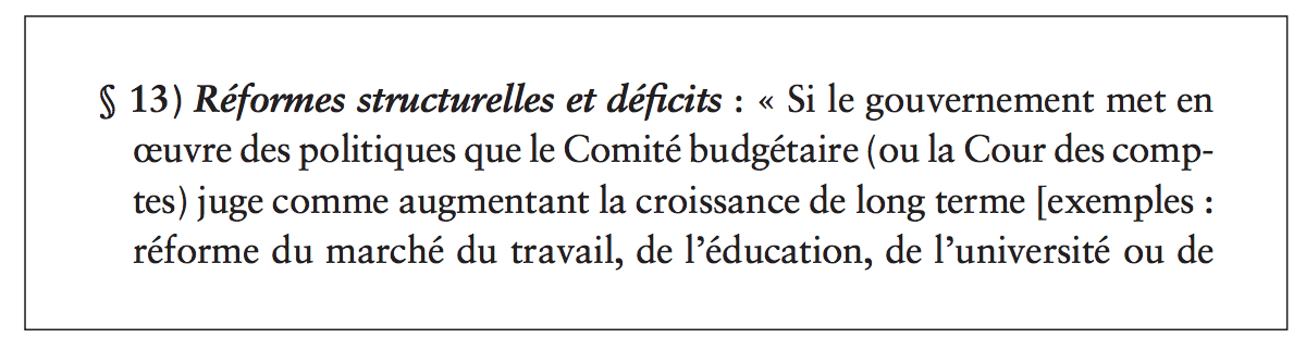 À côté de la réduction des déficits, il est important de réduire la dette hors bilan de l’État (par exemple en réformant les retraites) ou de mettre en œuvre des réformes structurelles susceptibles d’augmenter notre croissance de long terme. Or, un gouvernement ayant un capital politique limité, il est à craindre qu’il ne veuille pas entreprendre une réforme majeure (exemples : retraites ou marché du travail) s’il doit en même temps allouer du capital politique pour maintenir l’équilibre budgétaire. Il est difficile politiquement pour un gouvernement d’entreprendre plus d’une grande réforme par an. Un exemple : au deuxième trimestre 2003, en phase basse du cycle conjoncturel (1,1% de croissance en 2003), le gouvernement Raffarin avait lancé une réforme des retraites courageuse (même si insuffisante), avec une réduction de la dette hors bilan du pays de 30% du PIB en une seule fois15. Au moment même où le gouvernement lançait sa réforme et affrontait nombre de manifestations et de mouvements sociaux, le déficit public de 2002 fut évalué à 3,1% du PIB (au lieu des 2,9% préalablement estimés). Cela déclencha, de la part de la Commission européenne, une procédure de déficits excessifs contre la France, suivie d’une bataille envenimée entre le gouvernement français et la Commission. Il fut alors proprement suprenant que la Commission traînât la France devant la Cour de justice de l’Union européenne, au motif que son déficit de 2002 était passé de 2,9% à 3,1% du PIB (ce qui est ridicule comme écart), alors même que le gouvernement avait réduit la dette hors bilan de 35 points de PIB16. Le § 13 de la règle proposée reprend l’idée d’aider un gouvernement qui entreprend des réformes importantes, coûteuses politiquement, en ne lui imposant pas un équilibre budgétaire l’année de la réforme et la suivante. Il pourra ainsi, au besoin, lâcher quelques compensations budgétaires temporaires pour faire passer sa réforme. Toutefois, il faut un garde-fou à cette exception : le gouvernement ne doit pas être juge et partie. Au titre de ce § 13, il ne doit ni être juge de sa réforme ni décider de l’ampleur des déficits possibles autorisés en conséquence. Sinon, on verrait les gouvernements expliquer chaque année que la moindre réforme (positive ou pas) est essentielle et l’autoriserait ainsi à ne pas respecter l’équilibre budgétaire. La crédibilité de la règle serait réduite très fortement. Si le gouvernement devait être juge de cela, autant renoncer au § 13 dans son entièreté. Dans le § 13, le Comité budgétaire indépendant estime l’ampleur de la réforme et, en conséquence, la taille du déficit autorisé l’année de la réforme et la suivante. Ce cas d’exception à la règle budgétaire en cas de mise en œuvre de réforme structurelle n’est pas prévu dans la nouvelle règle allemande.