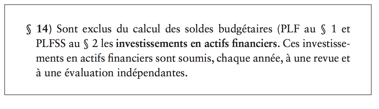 On peut être pour ou contre le fonctionnement actuel du FRR, pour ou contre des fonds souverains en France, mais il ne revient pas à la LOLF de les interdire. Dans ces deux cas, le gouvernement pourrait toujours théoriquement vendre ces actifs pour rembourser rapidement la dette publique. C’est ce qui légitime cette exception, alors même que nous avons refusé ci-dessus la règle d’or sur les investissements. Pourquoi ? Un gouvernement peut vendre rapidement des actifs financiers évalués sur un marché, alors qu’il ne peut pas vendre ses investissements passés dans des installations universitaires, des bâtiments publics ou dans le château de Versailles.