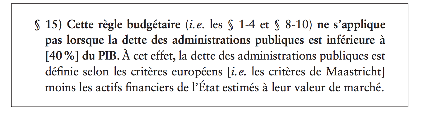 Enfin, dans le § 15 de la règle, la dette publique est entendue au sens de Maastricht (dette brute de toutes les administrations publiques), après déduction des actifs financiers de l’État. Il est en effet absurde que les liquidités monétaires du Trésor, nécessaires à une bonne gestion de trésorerie de la dette publique, ainsi que les participations de l’État dans des entreprises cotées ou les avoirs du fonds de réserve des retraites ne soient pas comptabilisés en déduction de la dette totale du pays. Si le gouvernement avait des problèmes de solvabilité, il pourrait toujours vendre ces actifs pourvu qu’il y ait un marché (c’est le même argument que pour le § 14). D’où la contrainte suivante : ces avoirs financiers de l’État doivent être cotés sur un marché afin qu’ils soient valorisables et réalisables.