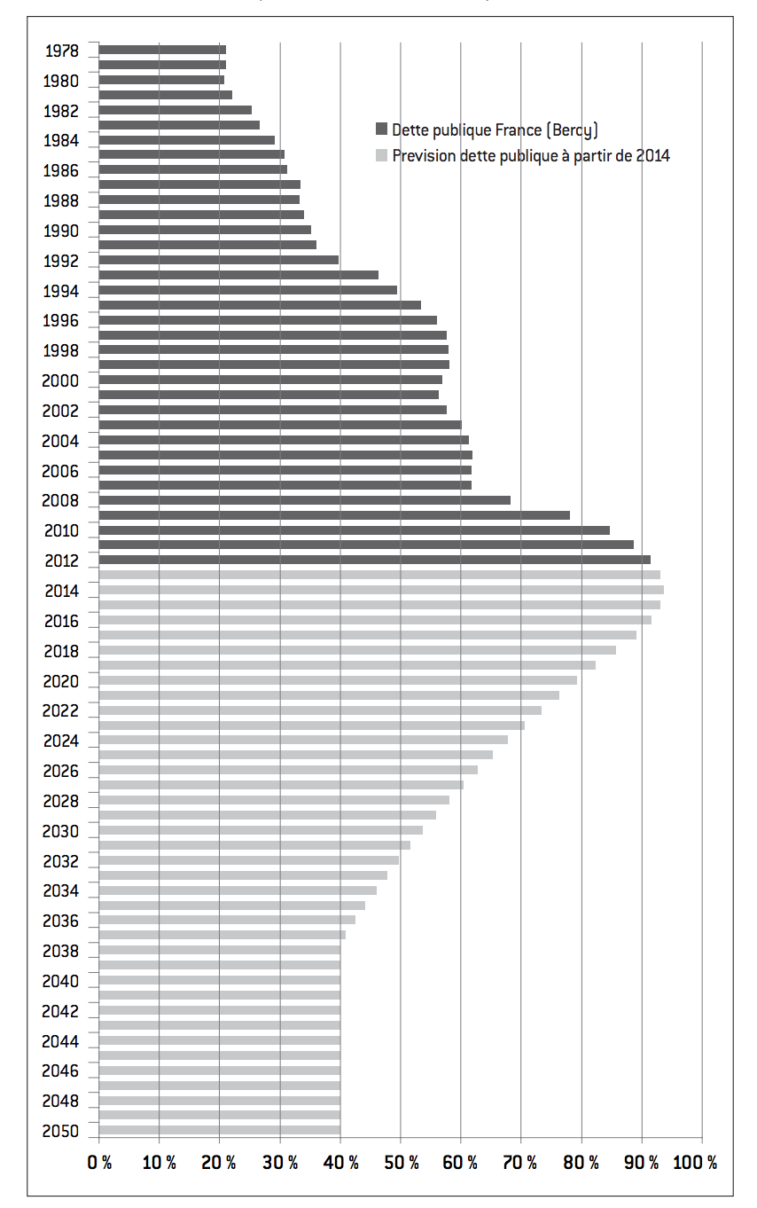Avec la crise actuelle, les déficits publics explosent (8,5% du PIB en 2010), et la dette devrait atteindre 90% à 95% du PIB en 2013, c’est-à-dire des niveaux inconnus jusqu’ici, hors sorties de guerre. Nos déficits structurels sont aujourd’hui de 5% à 6,5% du PIB. Si on ajoute à cela les déficits à venir du système des retraites et de l’assurance-maladie, nos déficits publics atteindront 8% du PIB vers 2020, et la dette s’envolera alors allègrement au-delà de 150% du PIB en 2025, puis de 200% en 2035, précipitant au passage l’effondrement de la notation de la France23… Mais attention, toutes ces extrapolations reposent sur une absence de réforme politique – ce qui est peu probable, d’où les propositions de cette note.