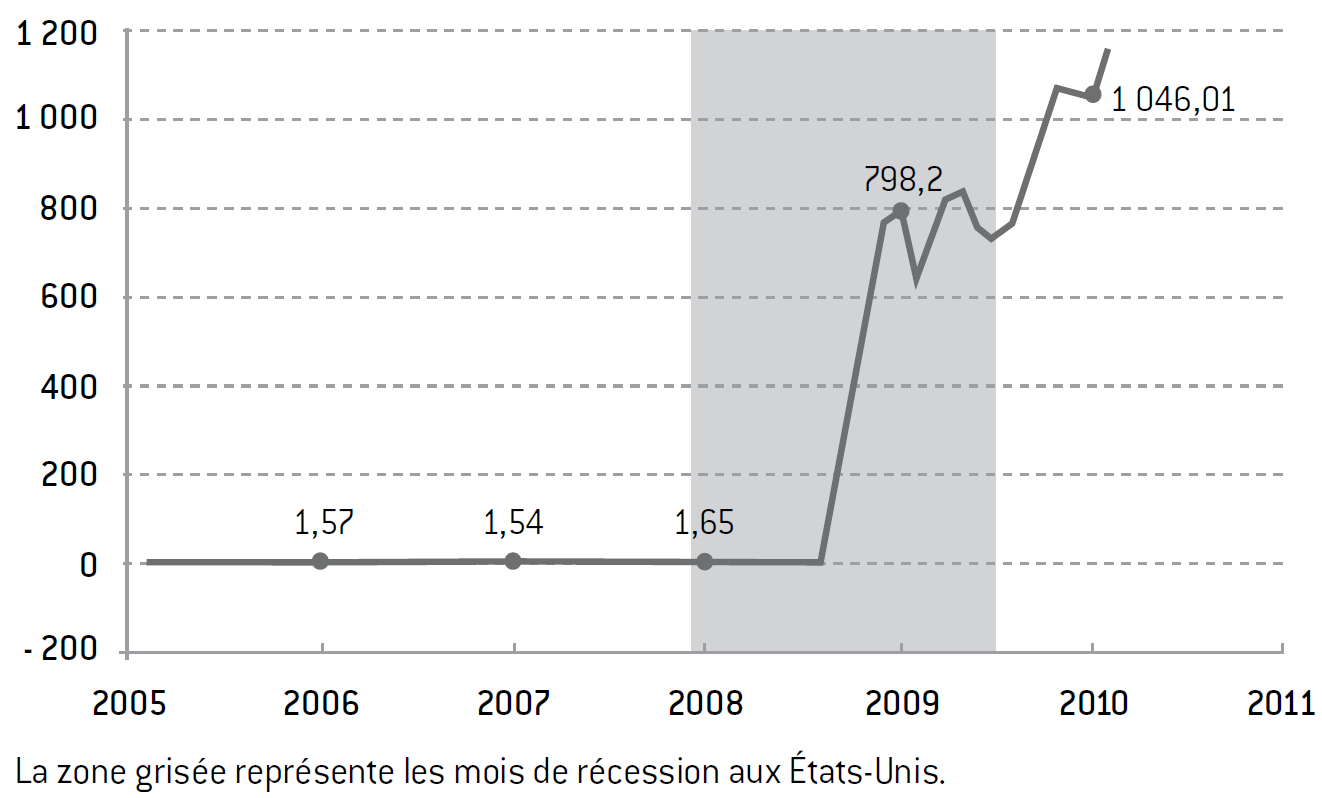 - Intervention directe de la Federal Reserve auprès d’investisseurs privés et de participants clés pour racheter leurs créances en échange de liquidités à travers les arrangements suivants : Commercial Paper Funding Facility, Asset-Backed Commercial Paper Money Market Mutual Fund Liquidity Facility, Money Market Investor Funding Facility et Term Asset-Backed Securities Loan Facility. Ces programmes exceptionnels ont été mis en place après la faillite de Lehman Brothers qui a particulièrement affecté le marché du Commercial Paper et l’ensemble de l’industrie des Money Market Mutual Fund ;
