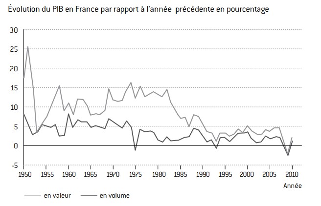 Les années difficiles sont 1967, 1975, 1983, 1993, 2003 et 2009. La relance de 1981 a donné à l’année 1982 un caractère aberrant. En outre, les années fastes, qui auraient dû connaître un excédent budgétaire, sont celles de la fin des années 1980 et de la fin des années 1990. La différence entre la courbe claire (évolution en valeur) et la courbe foncée (évolution en volume) correspond à l’inflation. On voit donc que l’économie française s’est débarrassée de l’inflation dans les années 1980. Au moment où l’État s’est remis à s’endetter, il a simultanément mis un terme à l’inflation qui avait réduit la dette née de la Seconde Guerre mondiale.