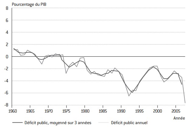 Cet effort a certes été facilité par la croissance économique de la période qui a été en moyenne de 3 % par an entre 1993 et 2007 (5 % en valeur), croissance due à la fois à la vigueur de l’économie américaine voisine et à la montée en puissance du secteur pétrolier. Mais si cette croissance a joué un rôle facilitateur, elle n’était pas à des niveaux tels qu’elle ait pu dispenser le Canada d’un effort discrétionnaire sur ses finances publiques.