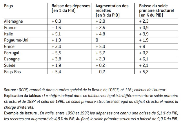 En dépit des controverses et des écarts d’évaluation d’un service statistique à un autre – notamment, pour la France, entre les chiffres de l’Insee, ceux de l’OCDE et ceux du FMI –, on peut retenir de notre tableau 1 que l’enjeu de l’effort à accomplir en France pour supprimer le déficit structurel est de l’ordre de 4,5 points de PIB, soit environ 90 milliards d’euros. Le gouvernement actuel a d’ailleurs entrepris une politique qui affiche comme objectif, par rapport à 2010, une réduction du déficit de 90 mil- liards d’euros. On pourrait donc penser qu’il s’inscrit dans notre logique.